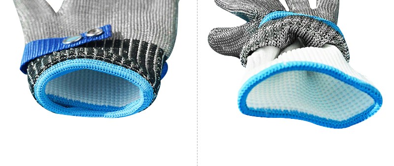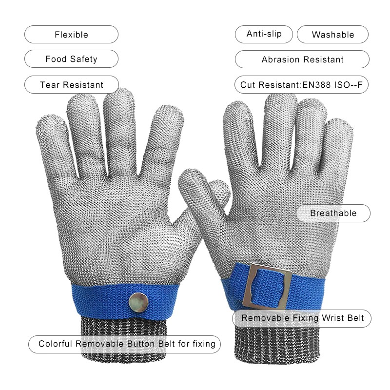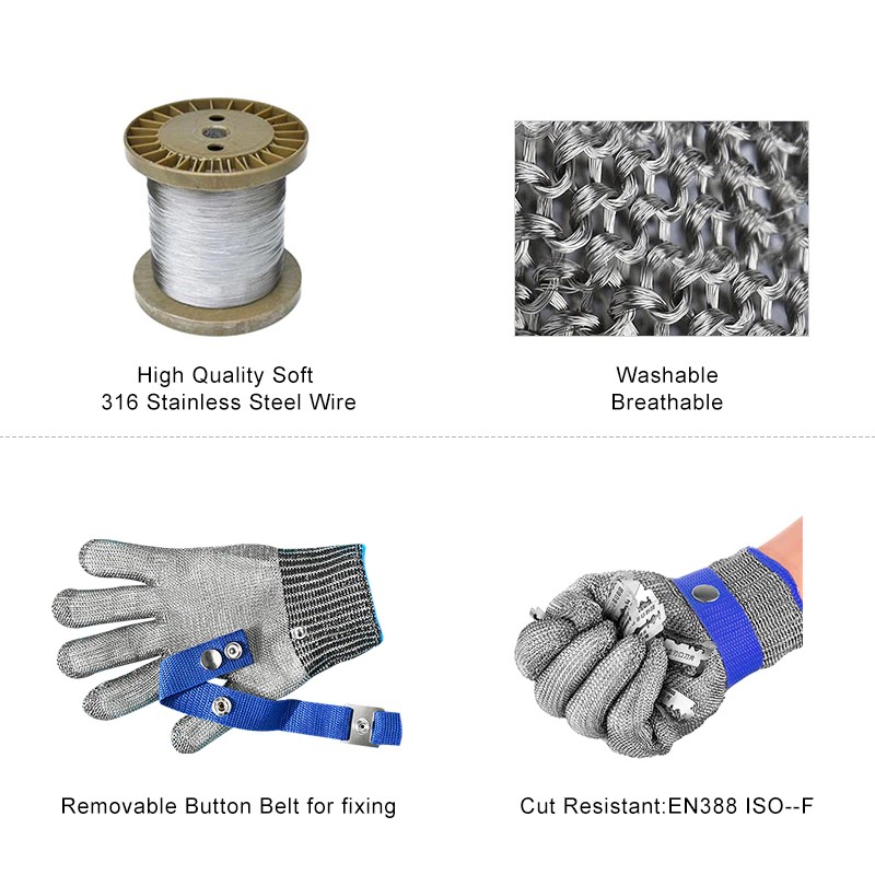 Gemaakt van hoge sterkte food grade roestvrij staaldraad, sterker dan algemene niveau 5 handschoen, en het zal uw handen beter bescherming. De interne platte geweven structuur maakt het comfortabel om te dragen. Verwijderbare Knop Riem, brengen een comfortabel gevoel.