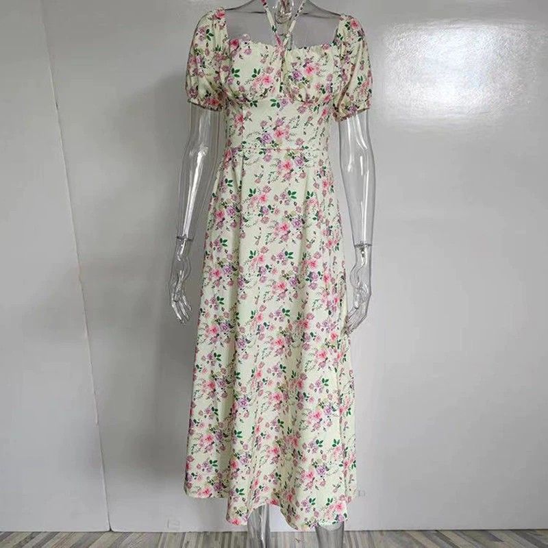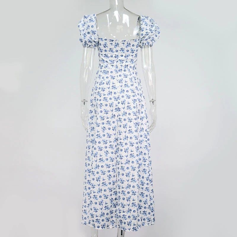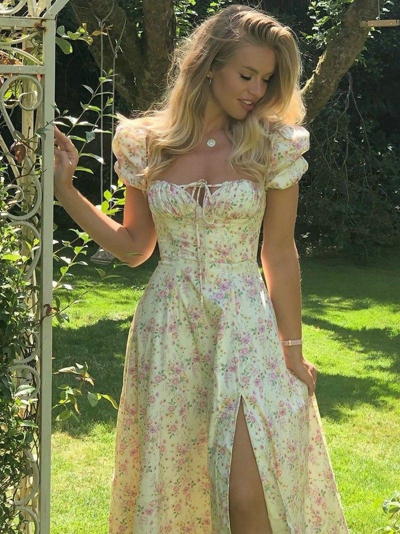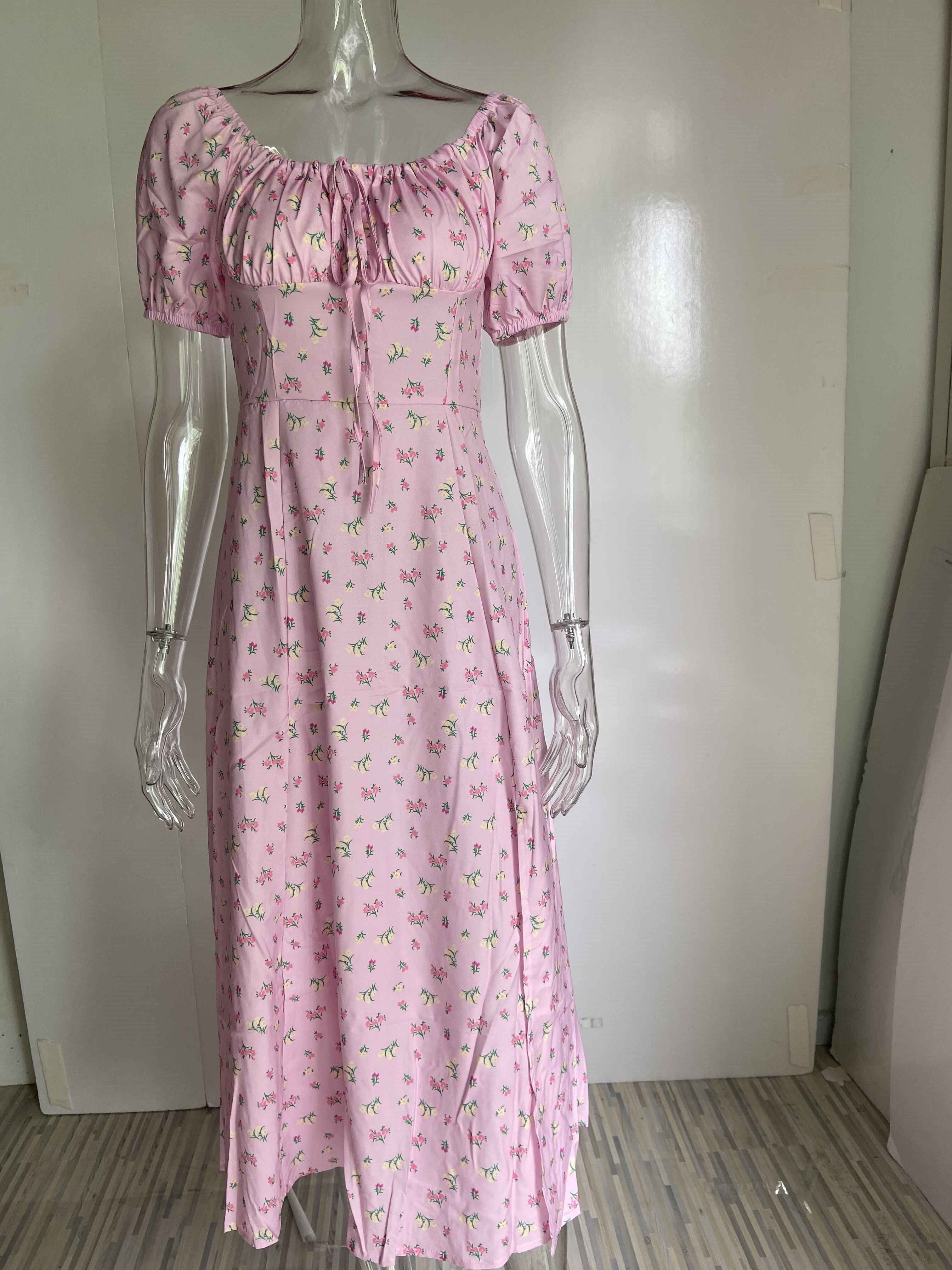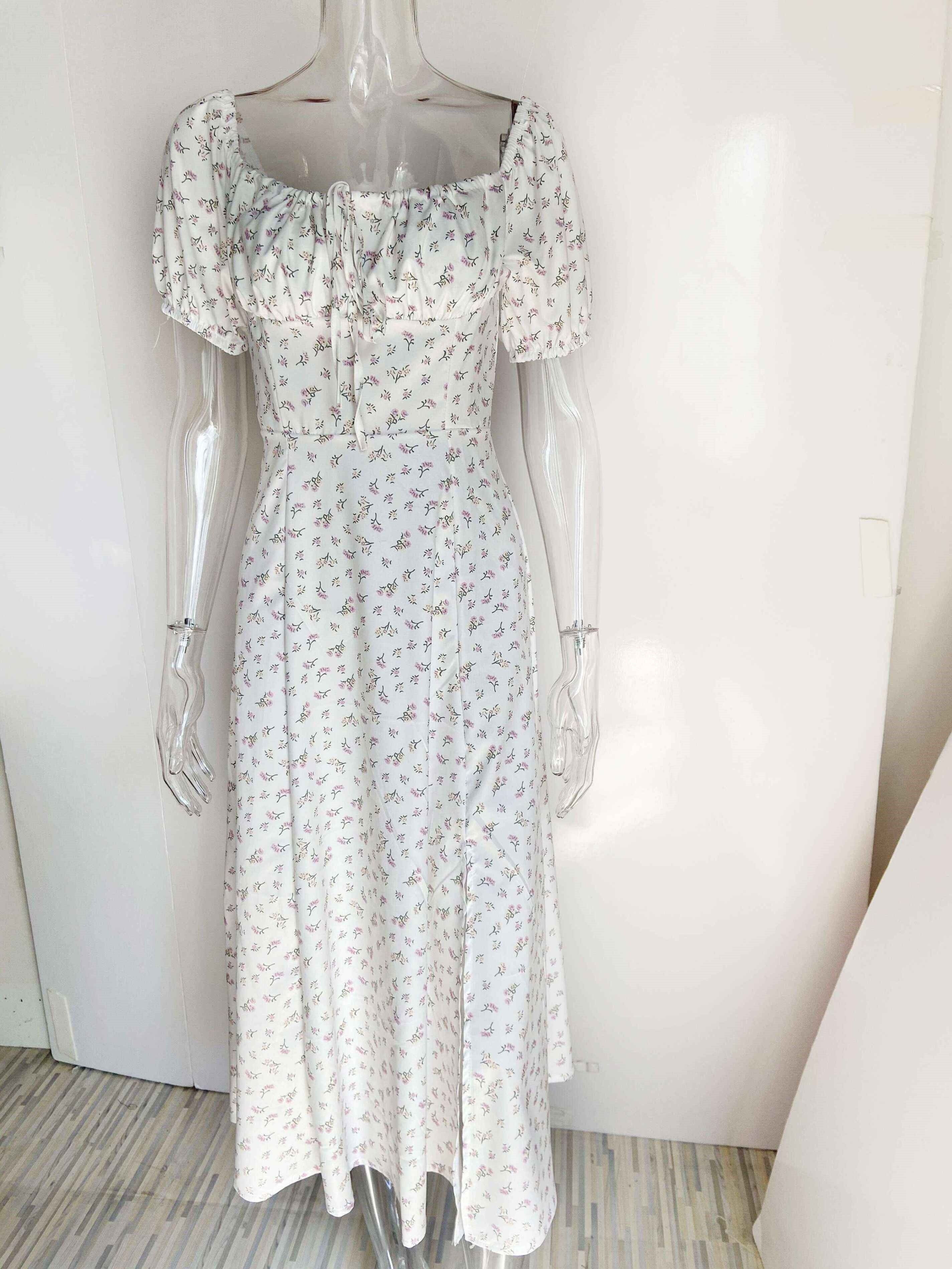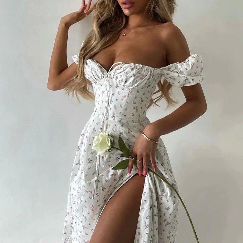Zomer Jurk Vrouwen Korte Puff Mouwen Flroal Gedrukt Ruches Party Hoge Split Lange Maxi Jurken Trekkoord Sexy Vestidos Zonnejurk