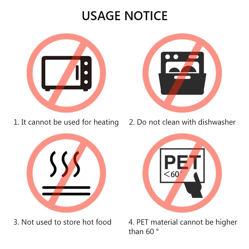Deze opslag containers kan niet worden gebruikt voor verwarming, magnetrons, ovens en vaatwassers, en kan niet worden gebruikt voor voedsel uitzendt warmte, omdat HUISDIER materialen kan niet hoger zijn dan 60 graden Celsius.