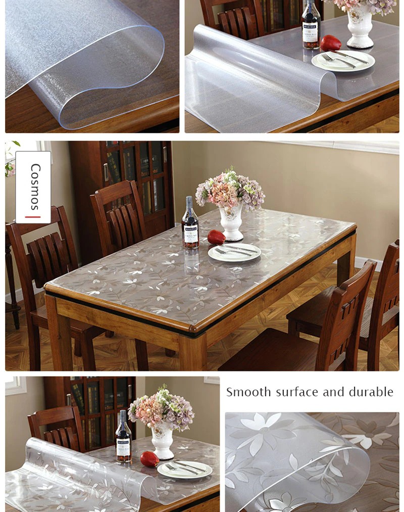 Feito deMacio e durávelPlástico PVC vinil com hot-prensado em um rolo. Esta clara tampa de tabela PVC é durável, à prova d 'água, óleo-resistant.