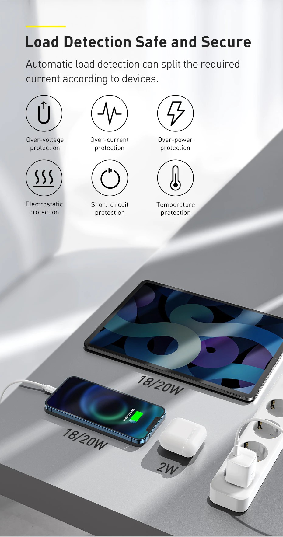Ondersteunt 9V/2.22A 20W output en biedt USB PD quick charge voor Apple.