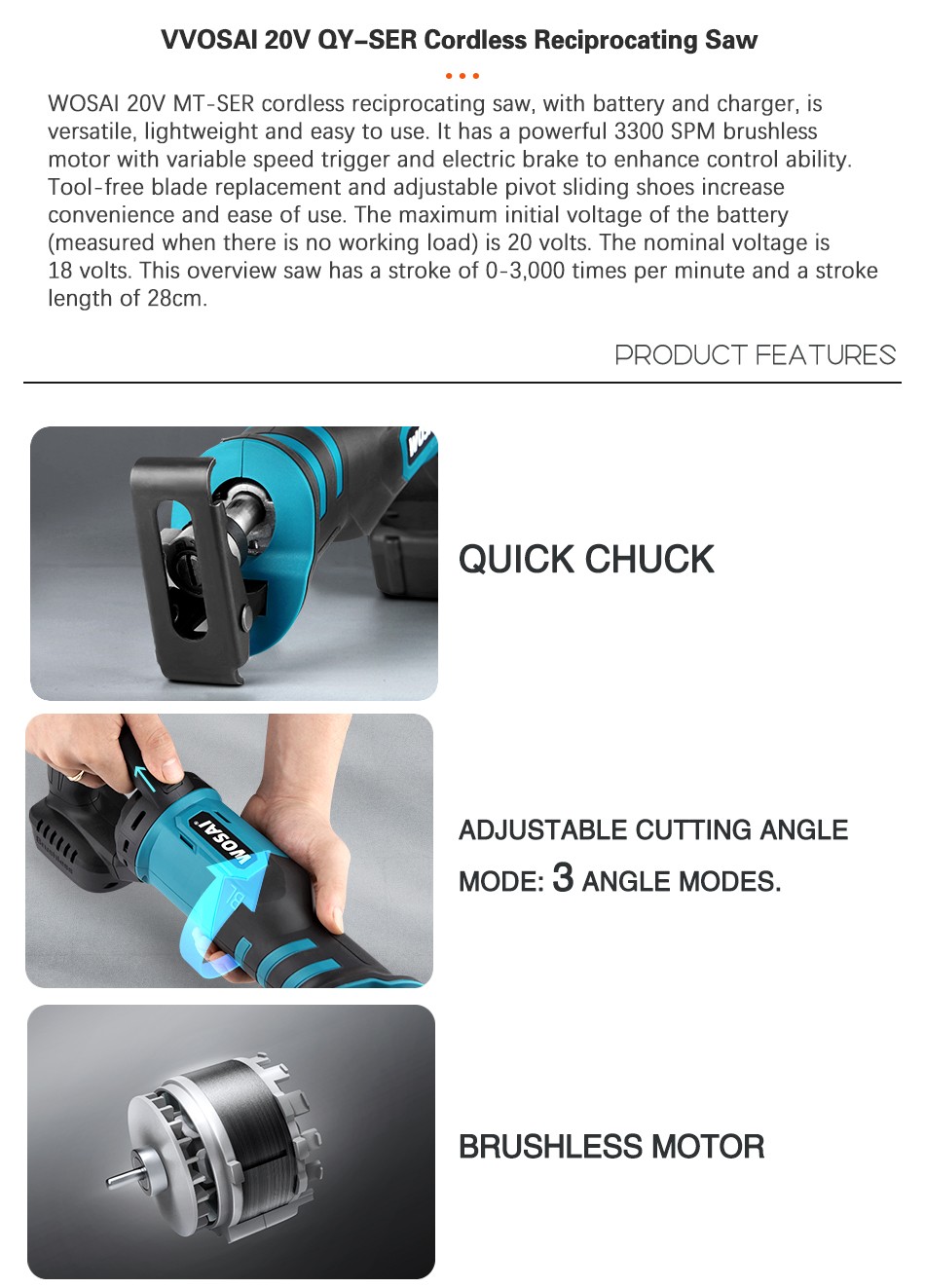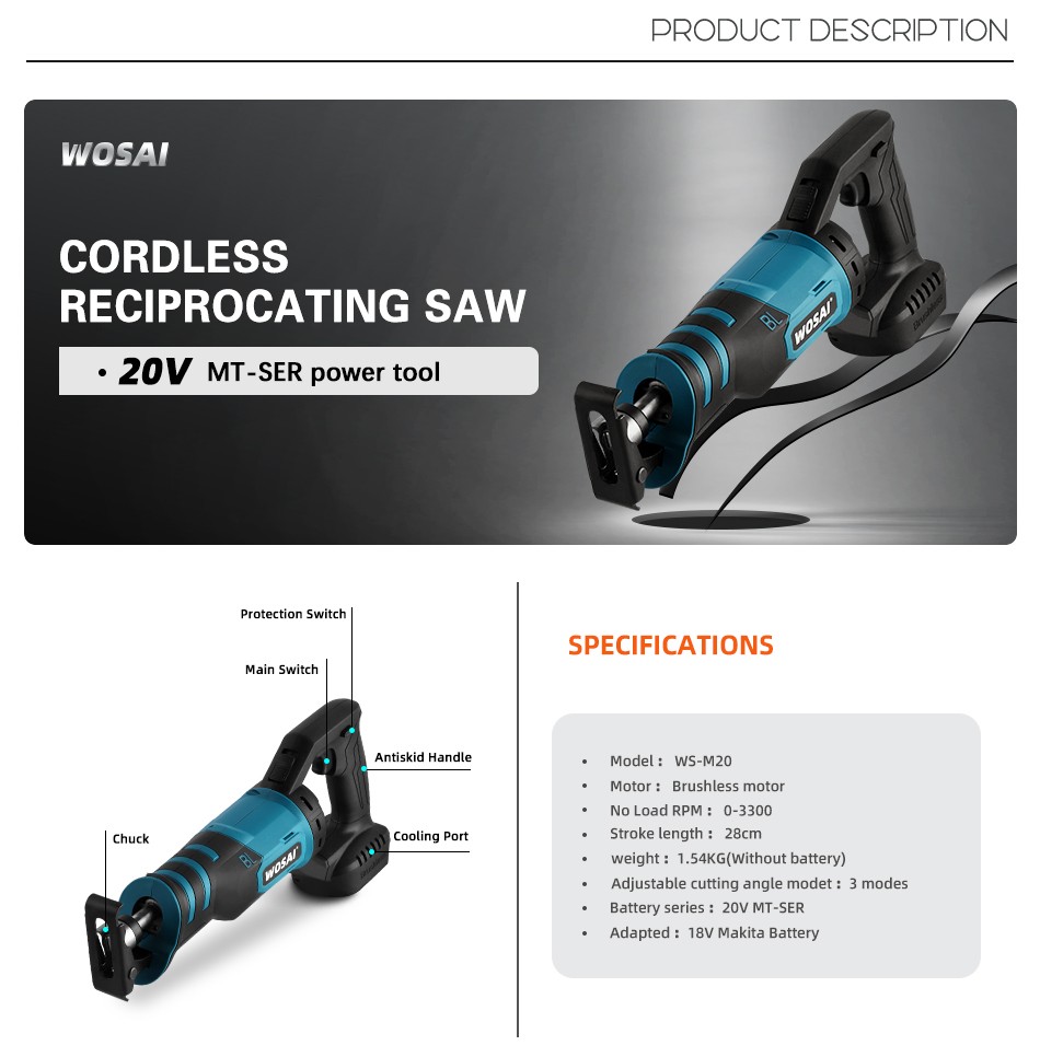 Wosai 20V Borstelloze Elektrische Reciprozaag Verstelbare Drie Oriëntaties Modi Snijden Zag Draagbare Accu-Gereedschap