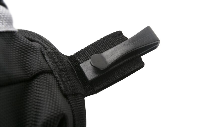 The bag features a clip and a loop for attaching to belt, and also has an extra pockets with fastening