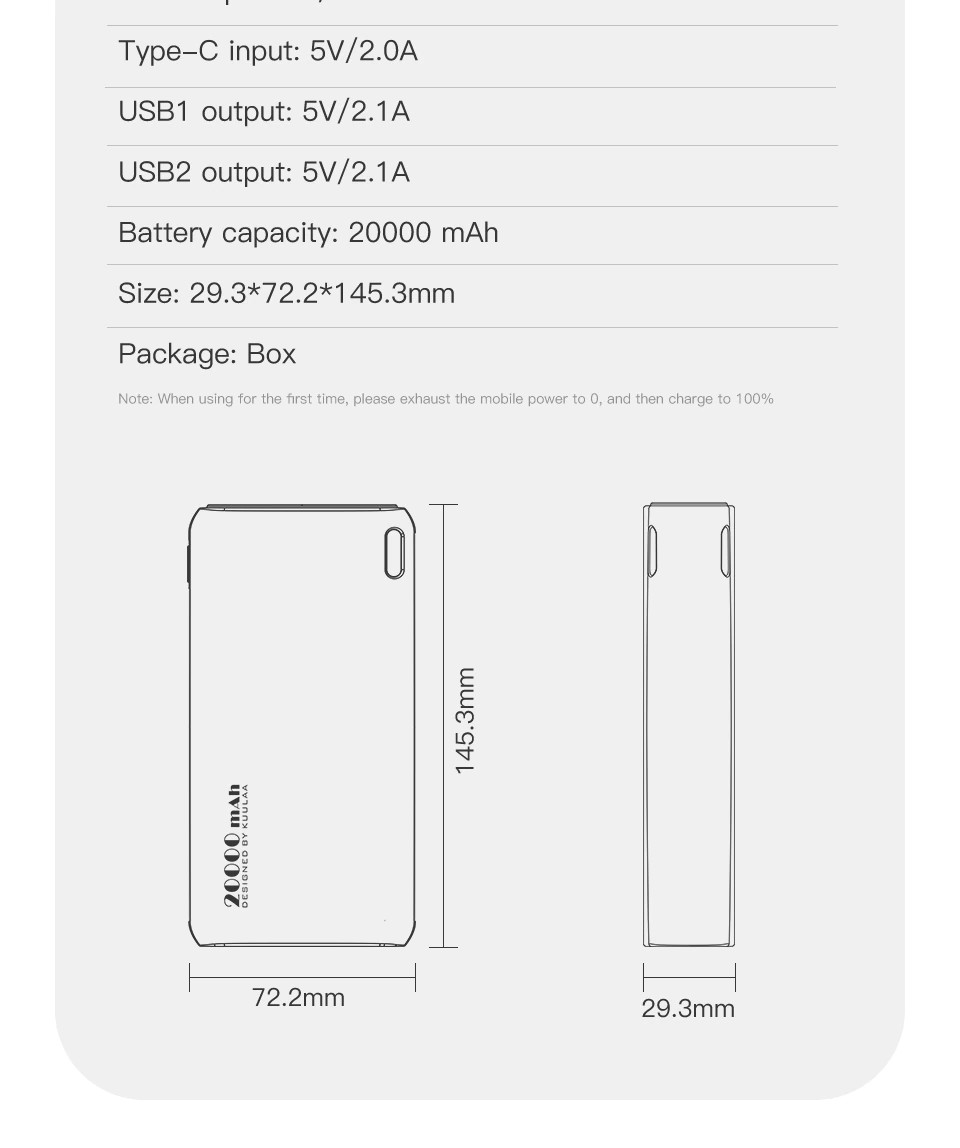 Battery capacity: 20000 mAh Size: 29.3*72.2*145.3mm