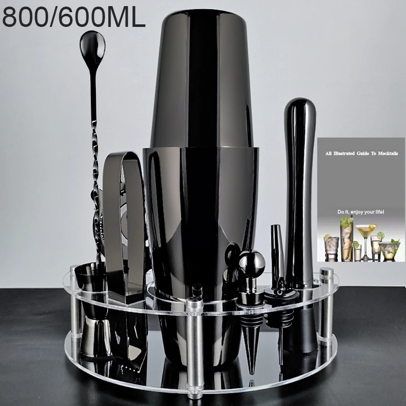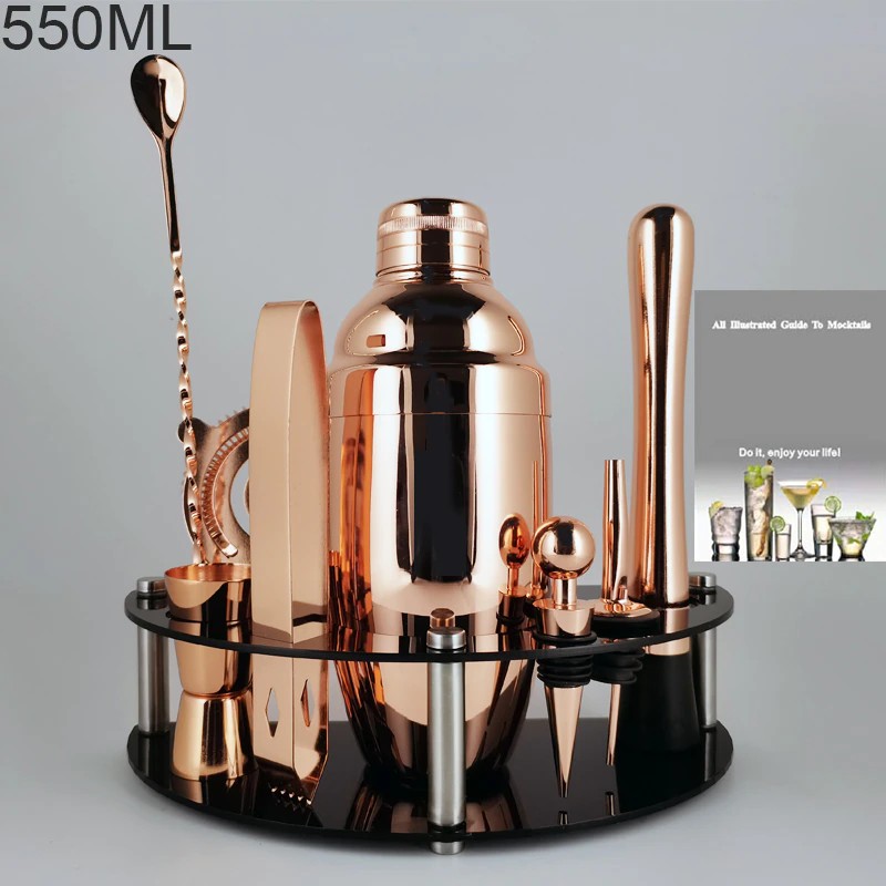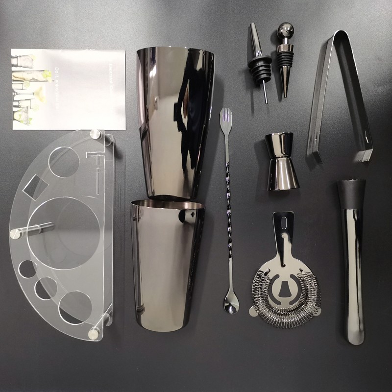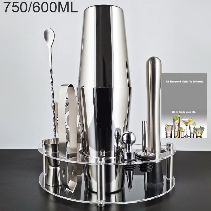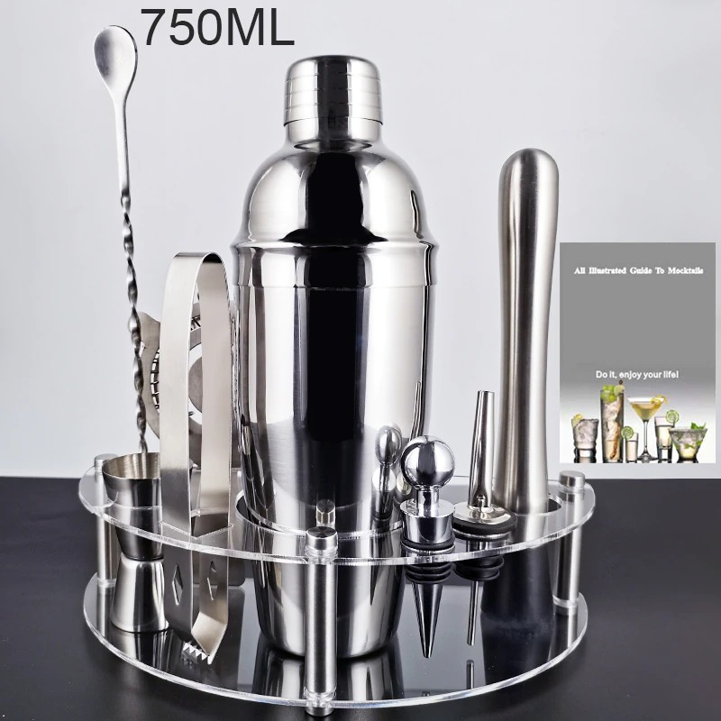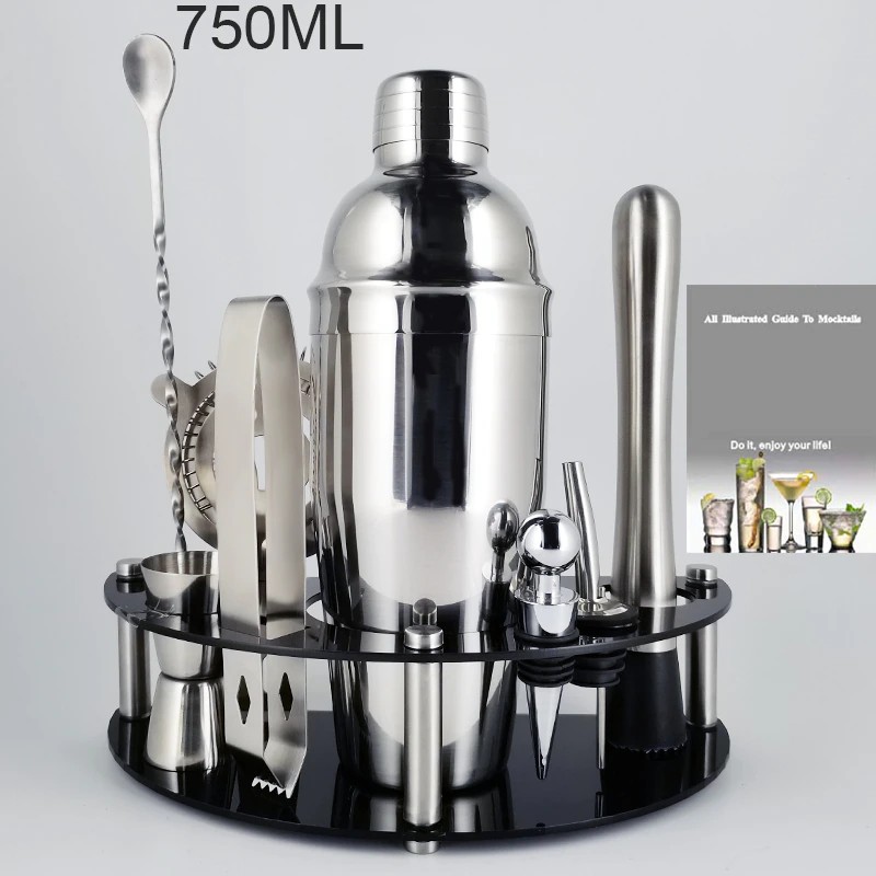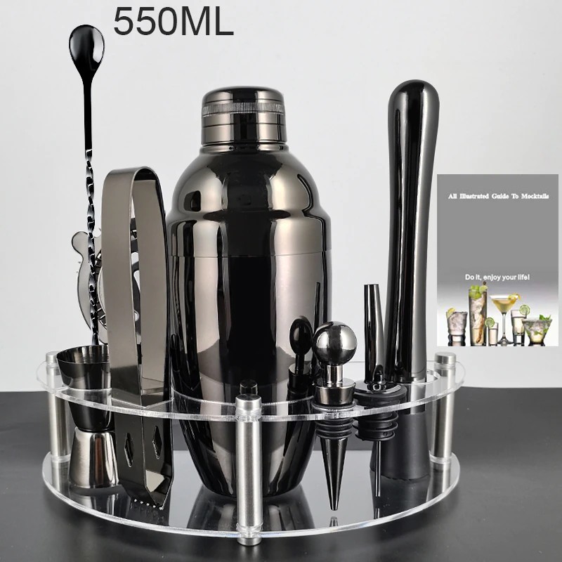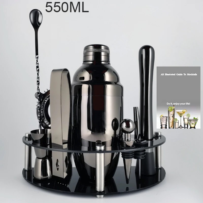 1 x shaker (prata/preto/ouro rosa/prata de vidro). 1 x muddler, 1 x filtro, 1 x pinças de gelo, 1 x colher e garfo, 1 x pour, 1x15/30ml quebra-cabeça dupla face, 1 x cortiça, 1 x receita de bebida, 1 suporte de acrílico (preto/transparente).