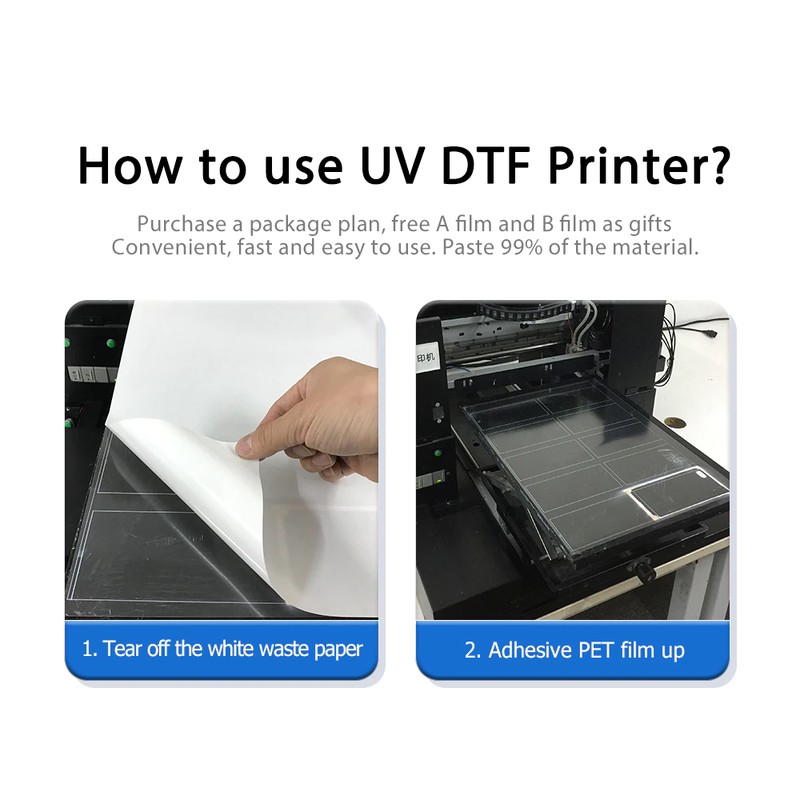 A impressora uv dtf é uma impressora plana com lâmpadas uv, referida como impressora uv. Imprime em um filme de pet auto-adesivo (um filme), e depois usa uma máquina de estratificação para transferir o padrão para o filme b, e depois colá-lo no objeto. Um novo método de adesivo de transferência, muito conveniente e rápido.