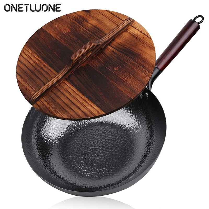 12.5 &Quot;Aço Carbono Wok, Woks E Fritar Panelas Com Tampa Cozinha Cookwar Para Fogões Elétricos, Indução E Gás Fundo Plano Wok