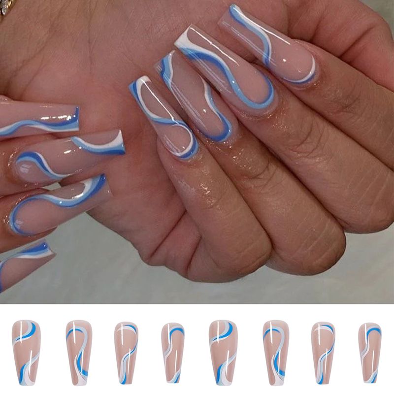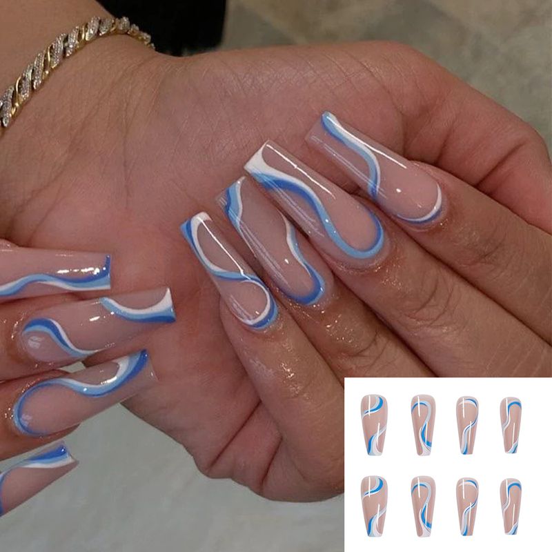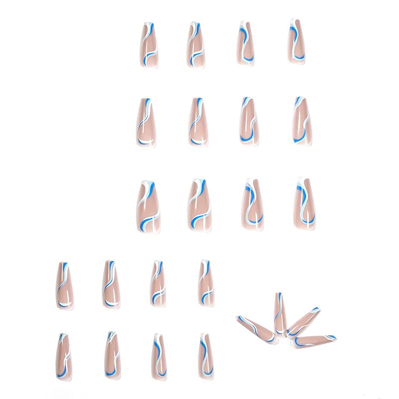 24 Pçs Azul Branco Ondulado Linhas Destacável Longo Bailarina Unhas Falsas Com Design Wearable Unhas Falsas Capa Completa Dicas De Unhas