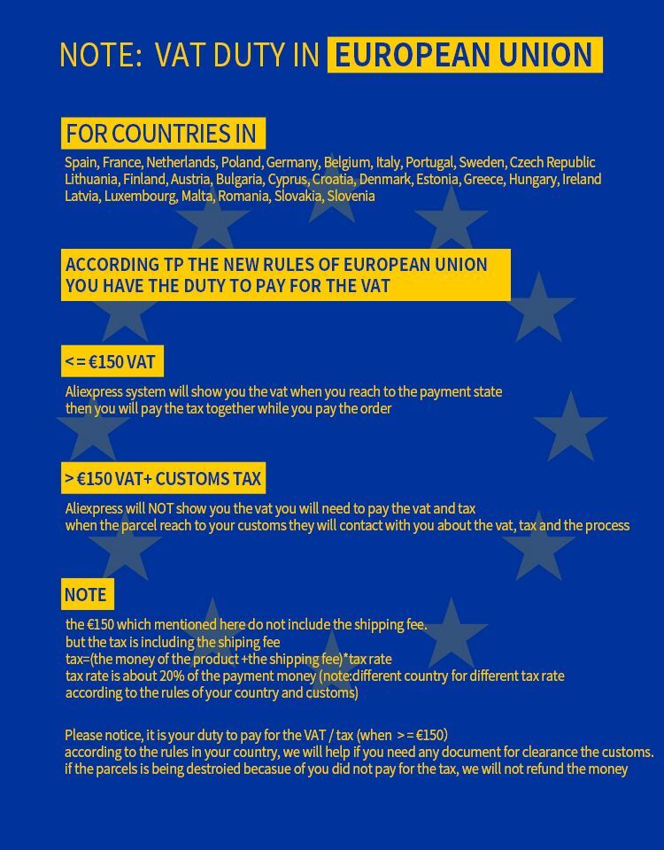 Aviso: é seu dever pagar o iva/imposto (quando> = € 150) de acordo com as regras do seu país, nós ajudaremos se você precisar de qualquer documento para desembaraço da alfândega. Se as encomendas estão sendo destruídas porque de você não pagou o imposto, não reembolsaremos o dinheiro