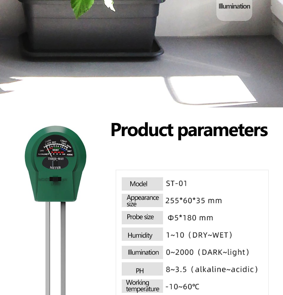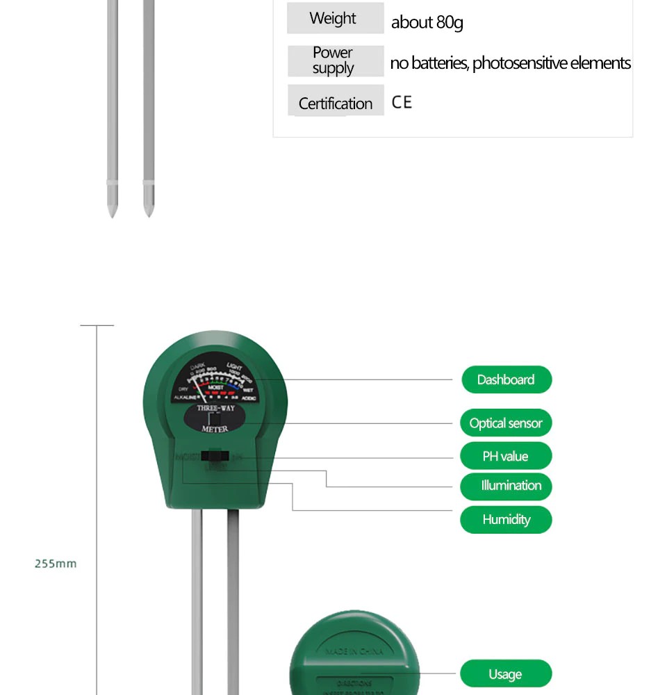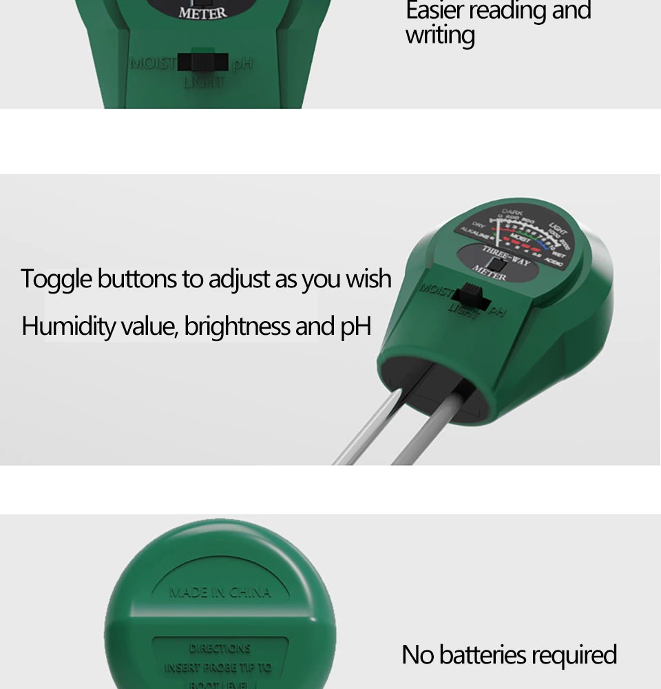 Nenhuma fonte de alimentação necessária, três funções em um, mede o grau de ph da umidade do solo/intensidade da luz solar necessária para a fotossíntese da planta.