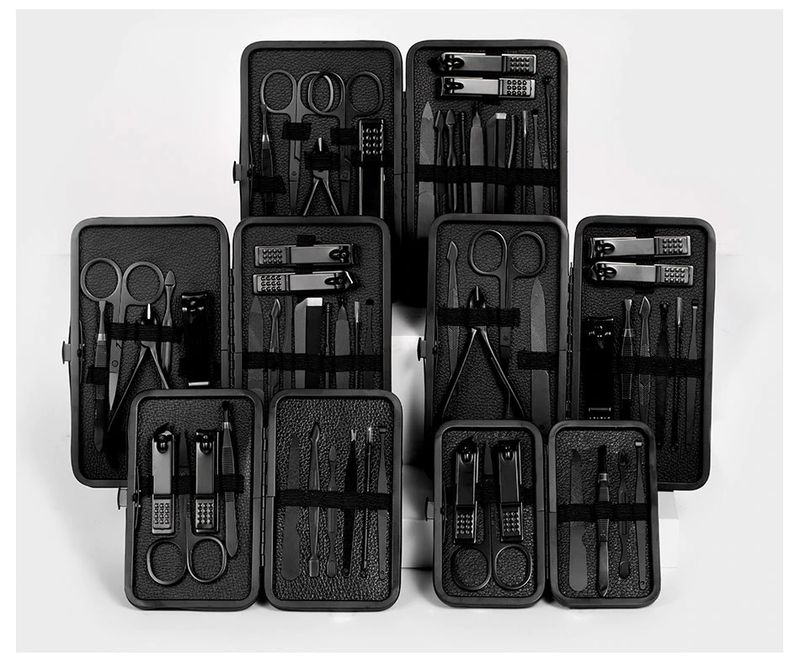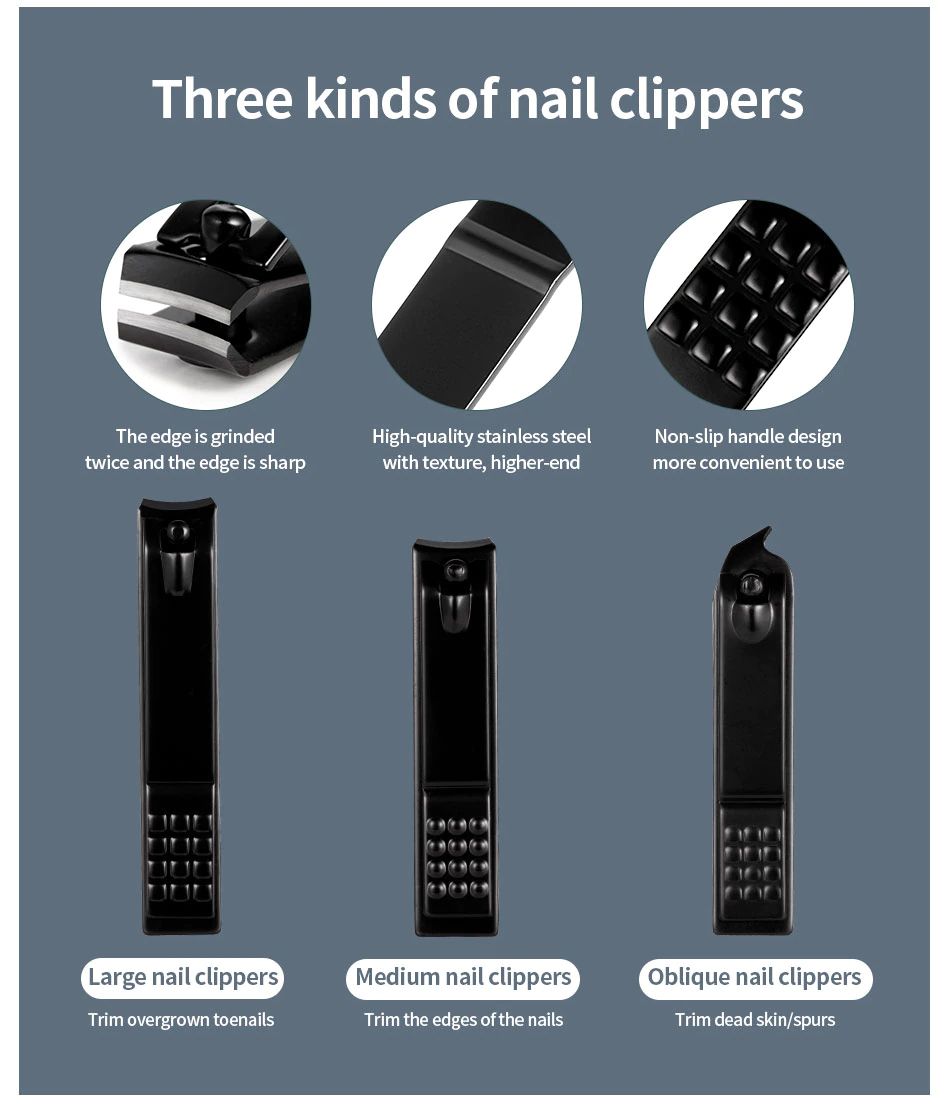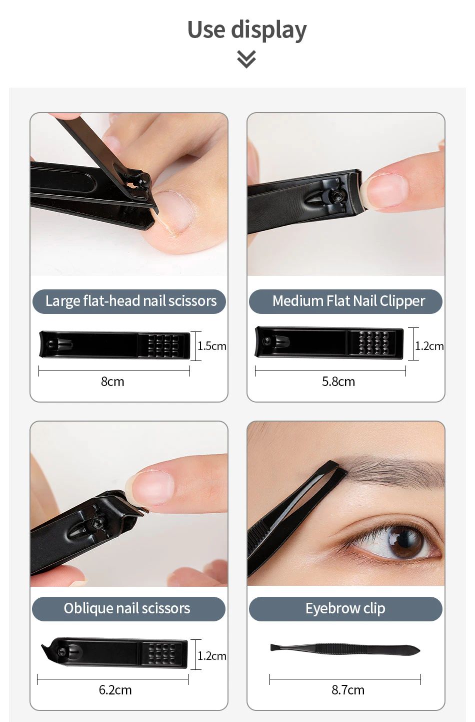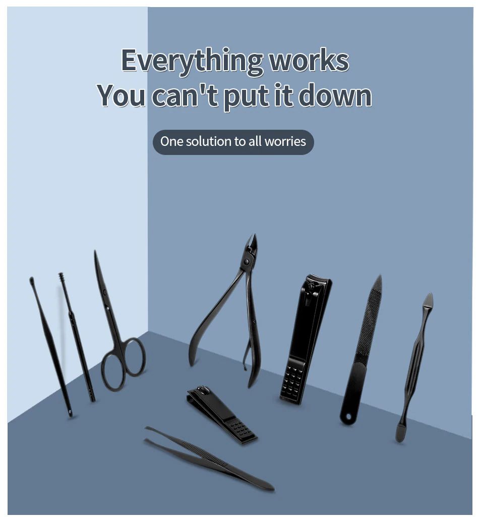 Nosso kit de unhas, seu destaque é ferramentas pretas com caso de textura de couro do plutônio, se sentir confortável, moda e prático. Esta é a primeira vez para mostrar no mercado. Você vai ser incrível sobre isso. Não só usando confortável, mas também fácil de aparar. Será um excelente presente de qualidade para o natal, aniversário, aniversário e casamento.