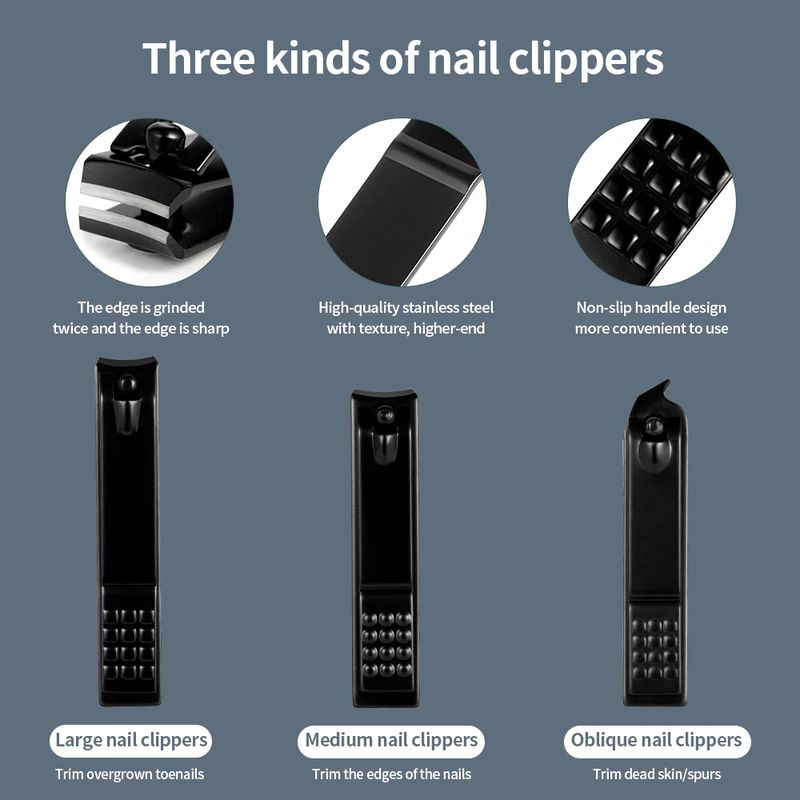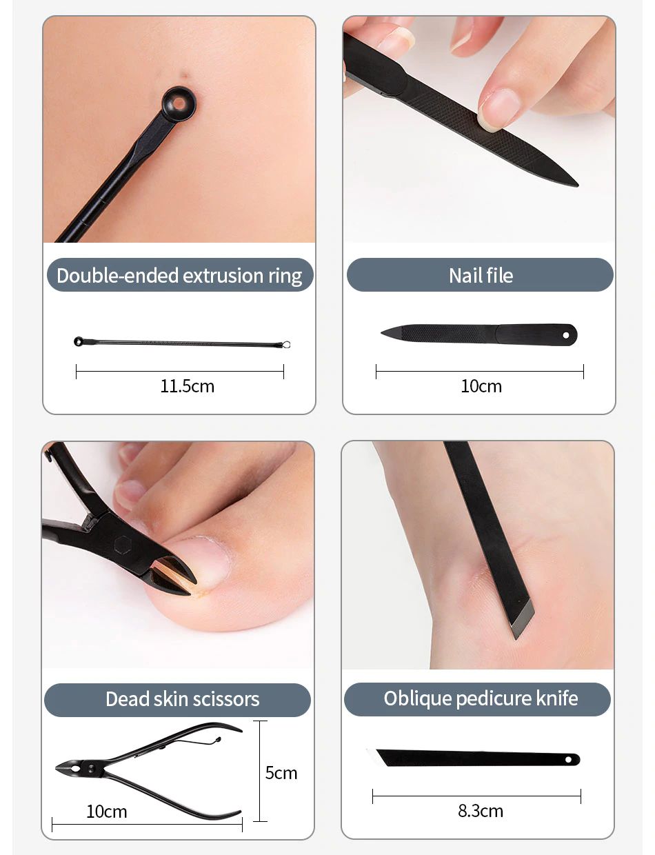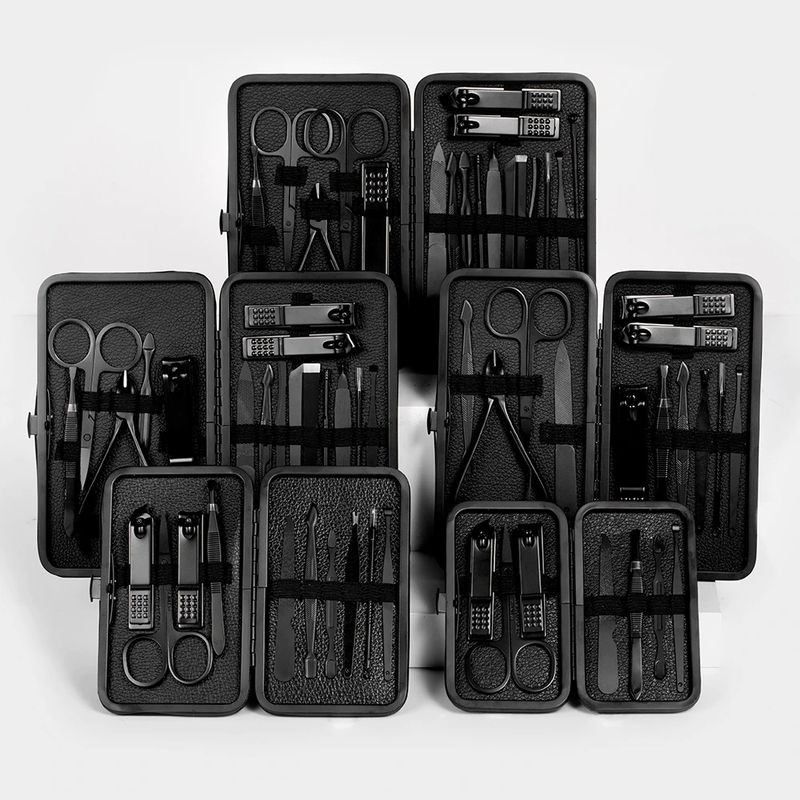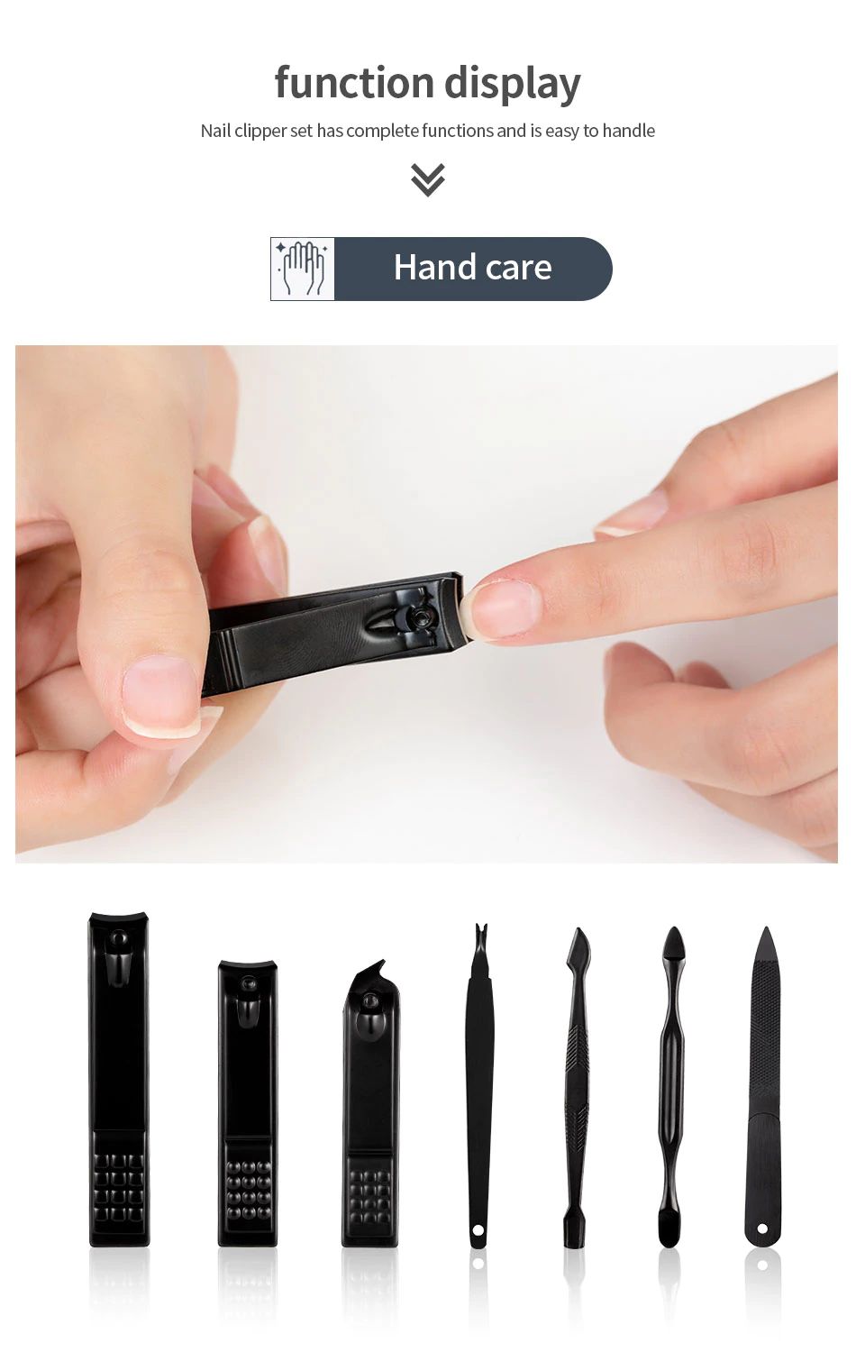 Nosso kit de unhas, seu destaque é ferramentas pretas com caso de textura de couro do plutônio, se sentir confortável, moda e prático. Esta é a primeira vez para mostrar no mercado. Você vai ser incrível sobre isso. Não só usando confortável, mas também fácil de aparar. Será um excelente presente de qualidade para o natal, aniversário, aniversário e casamento.