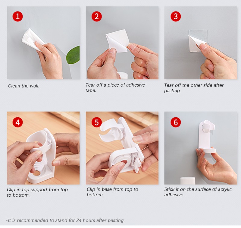 Como usar: limpar a poeira e óleo na parede, mantê-lo seco e explosão, arrancar a película protetora da fita adesiva e colá-la na parte de trás do suporte, pressione-o lisamente para descarregar o excesso de ar, encaixe o suporte superior no suporte traseiro, Clique na base no suporte traseiro, e coloque-o na imprensa da parede firmemente no rosto e deixe-o ficar por 24 horas antes de usar