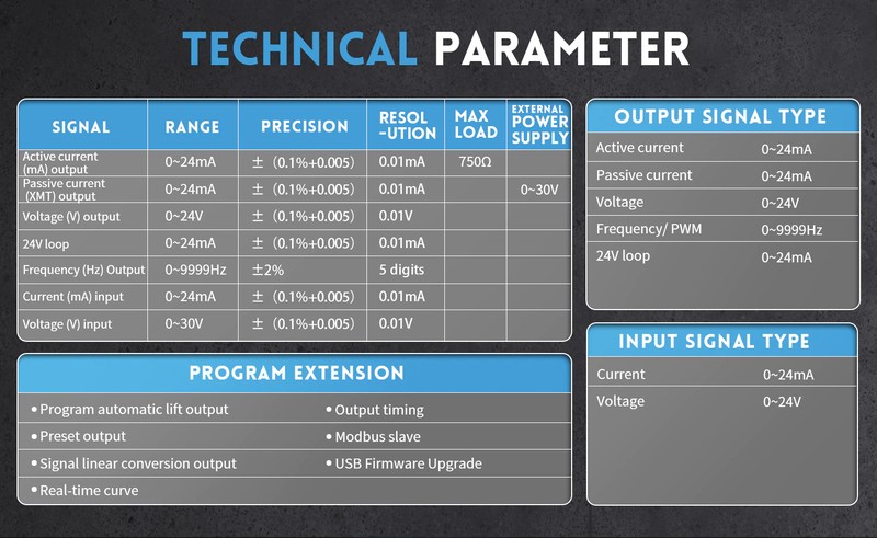 2. saída de corrente passiva: escala: 0-24 ma; resolução: 0.01 ma; fonte de alimentação externa até 30v; precisão: ±(0.1% + 0.005)
