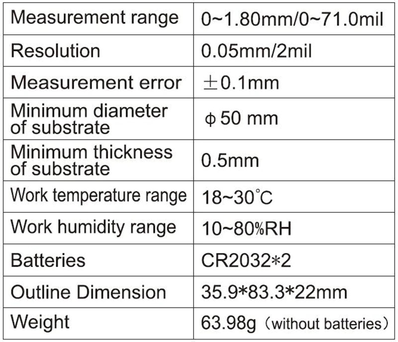 2. a resolução do dispositivo é de 0.05mm e a margem de erro é de +-0.1mm. é bom verificar se o carro está pintado ou não. Ele mostra 0.1mm quando o comprador verificar em seu carro, o que significa que é tinta original, não repintado. Se repintado, o resultado será superior a 0.2mm.