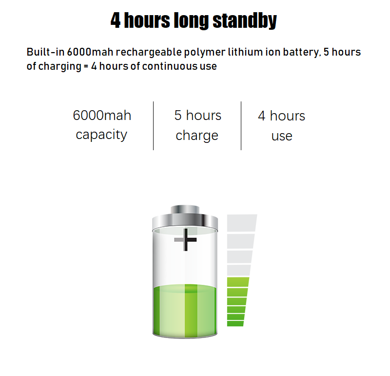 Construído em 6000mah bateria de lítio recarregável, totalmente carregada por 4 horas de uso contínuo com o mais alto brilho da tela.