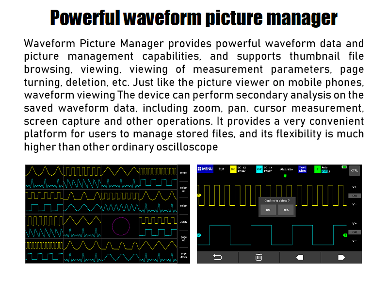 Poderoso gerenciador de imagens de forma de onda suporta navegação em miniatura, visualização, visualização detalhada, página de giro, exclusão e forma de onda zoom em, zoom para fora, em movimento, etc.