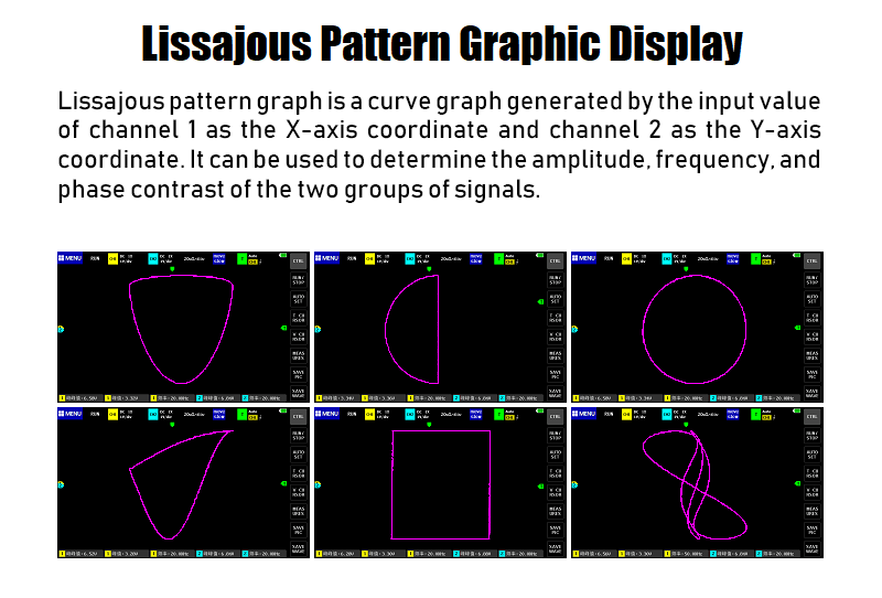 A função de exibição gráfica de figuras lissajous pode ser usada para determinar a amplitude, freqüência e contraste de fase de dois grupos de sinais.