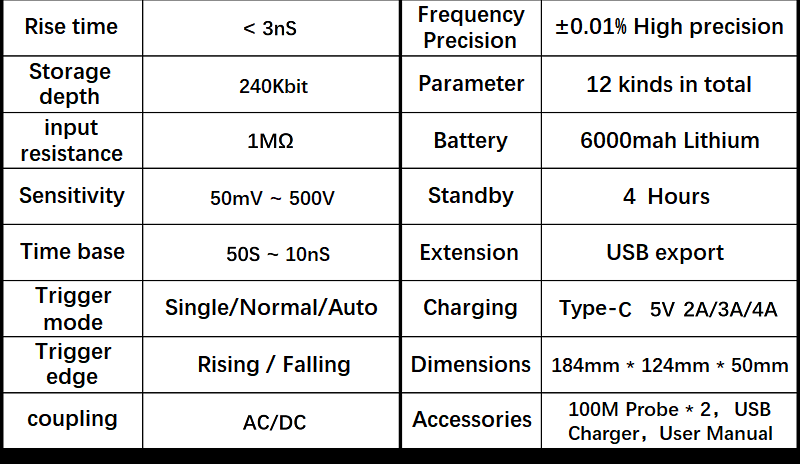 Built-in 1gb espaço de armazenamento, pode armazenar até 1000 screenshots + 1000 conjuntos de dados de forma de onda.