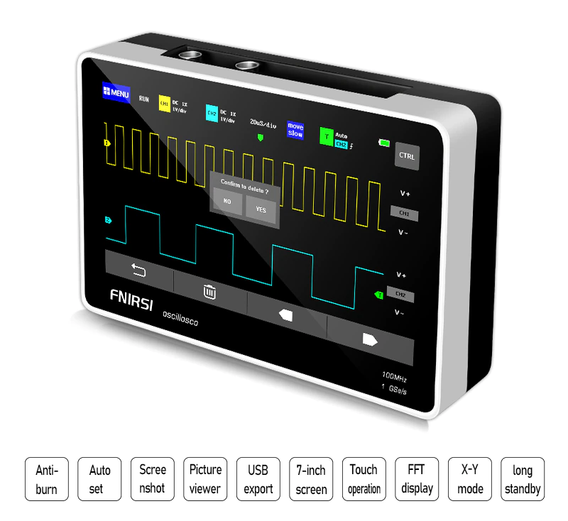 Fnirsi 1013d é um osciloscópio completo-caracterizado, altamente prático, econômico do painel plano do canal duplo para a manutenção e a indústria do r & d.