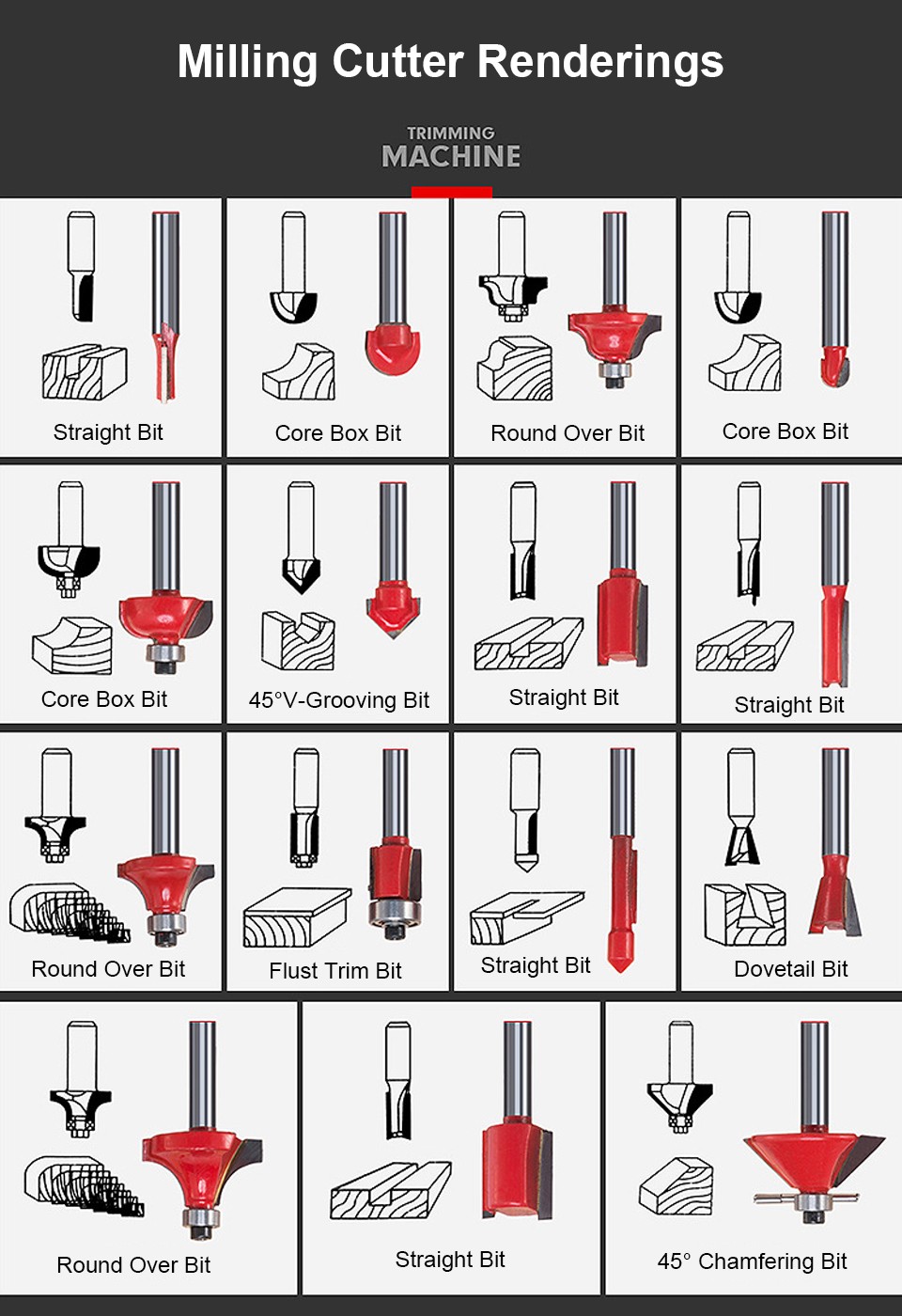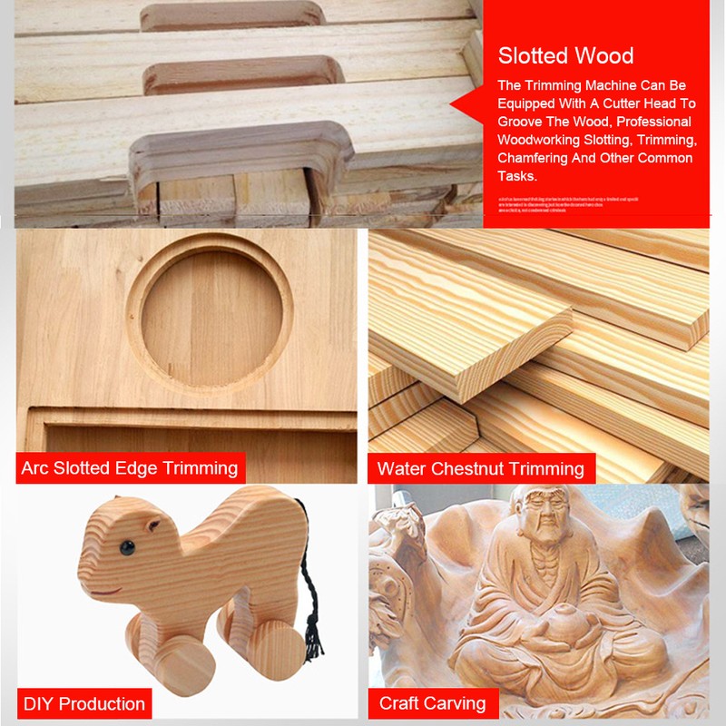 -Apropriado para chanfradura, sulco, tratamento de superfície, corte de curva, arestas de madeira de aplainamento, atividades de processamento de padrão de madeira, pano plástico, folheado de madeira e outros materiais semelhantes.