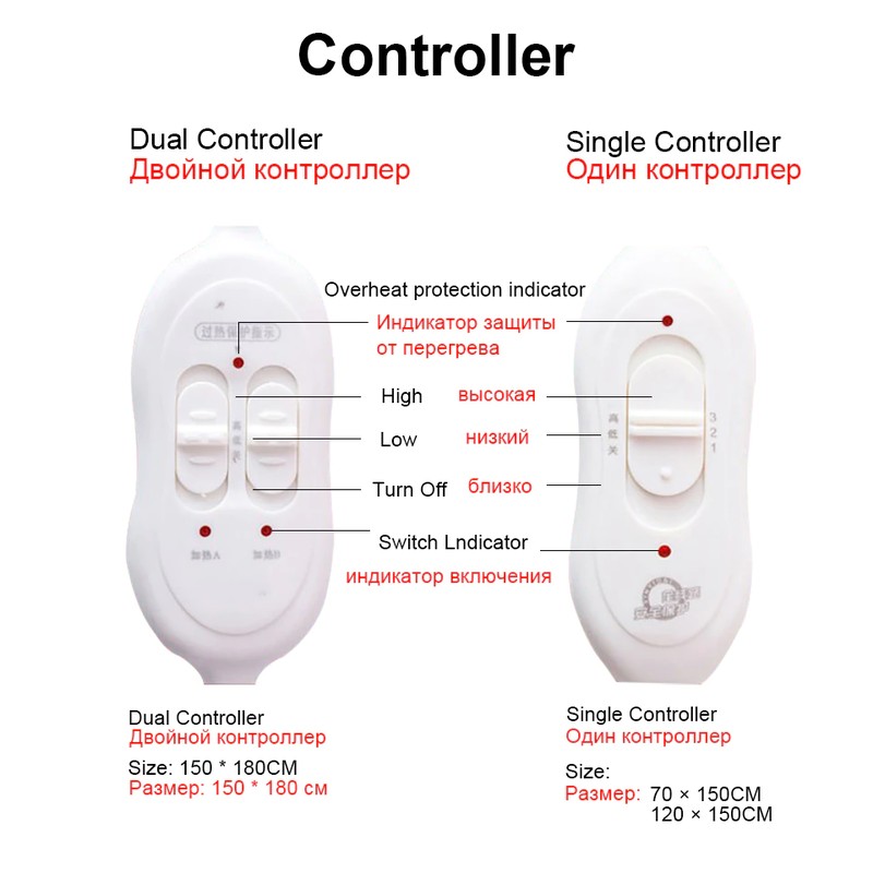 1. controlador duplo (150*180cm), existem 3 engrenagens, alta temperatura, baixa temperatura e interruptor, pode controlar a temperatura dos lados esquerdo e direito separadamente 。