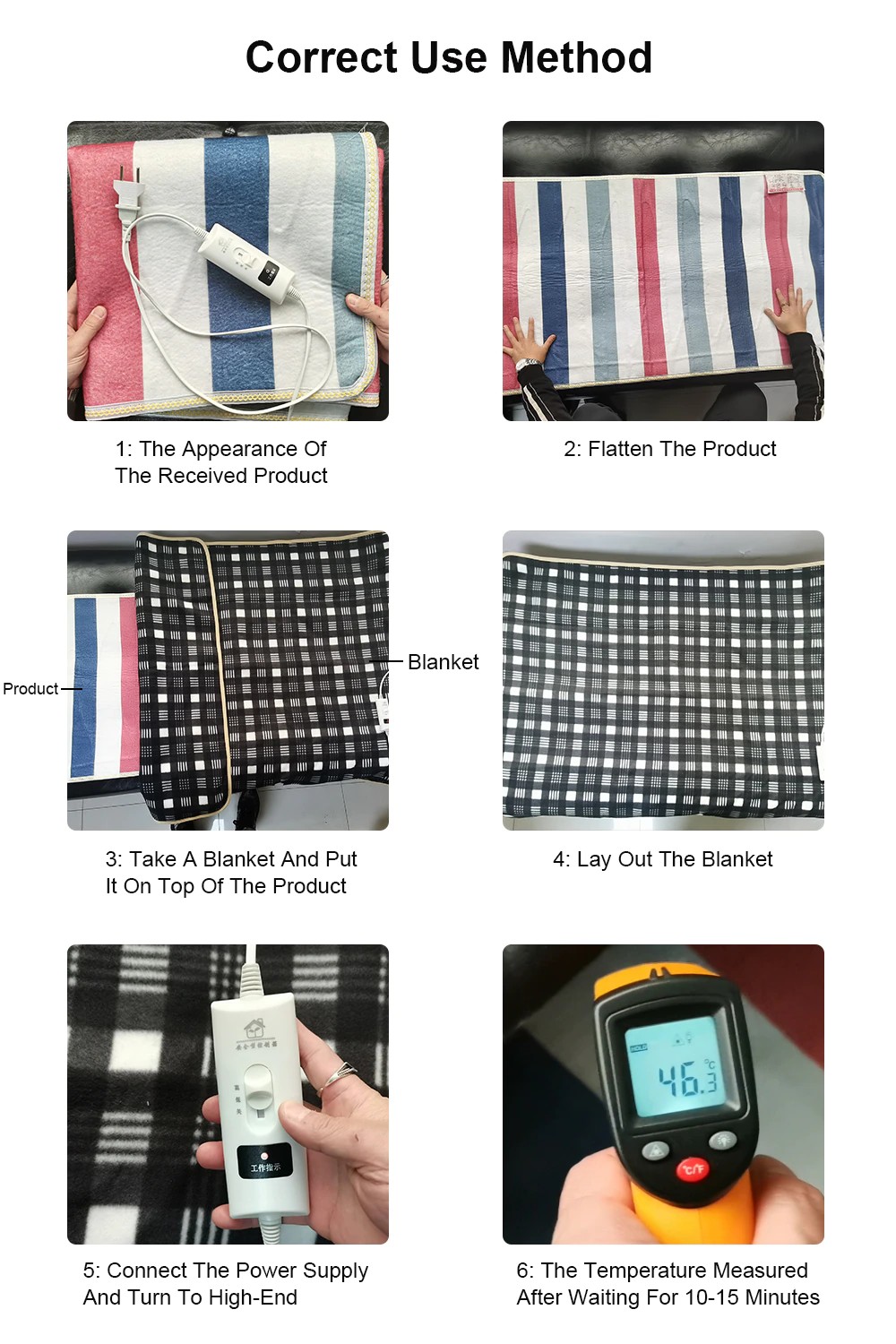Nota: por favor, coloque sua colcha grossa, cubra o cobertor elétrico sobre 30-60minutes, ou a temperatura sobe não obviamente.