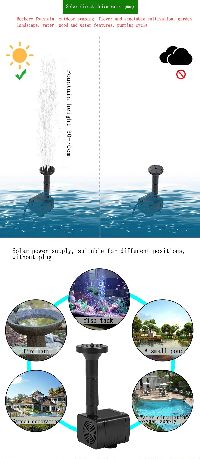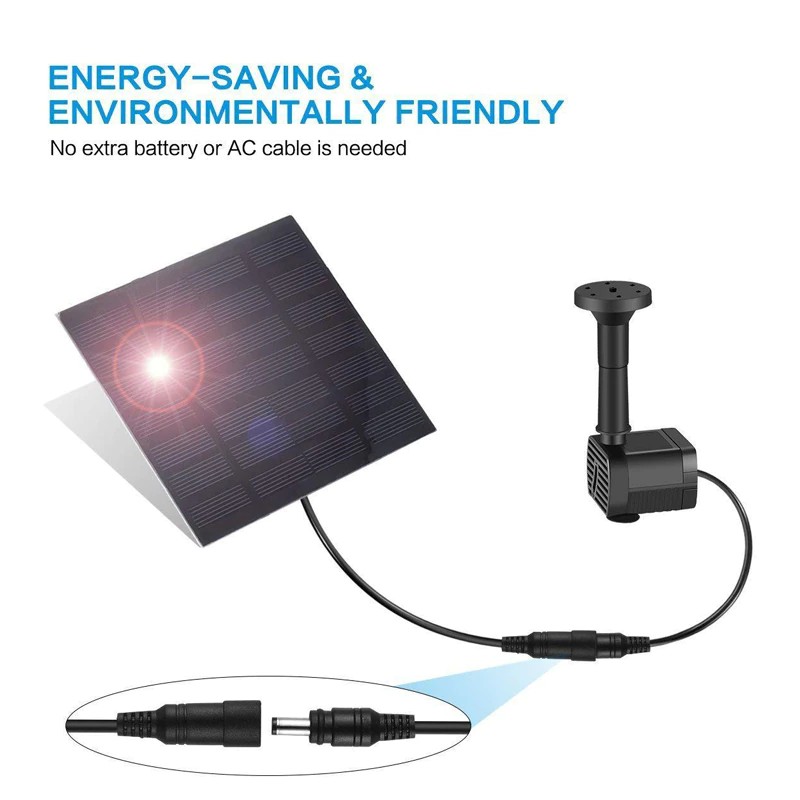 2) coloque o painel solar em um lugar adequado para garantir que não seja obscurecido por outros objetos. Quando o painel solar recebe luz suficiente, a bomba de água funciona normalmente.