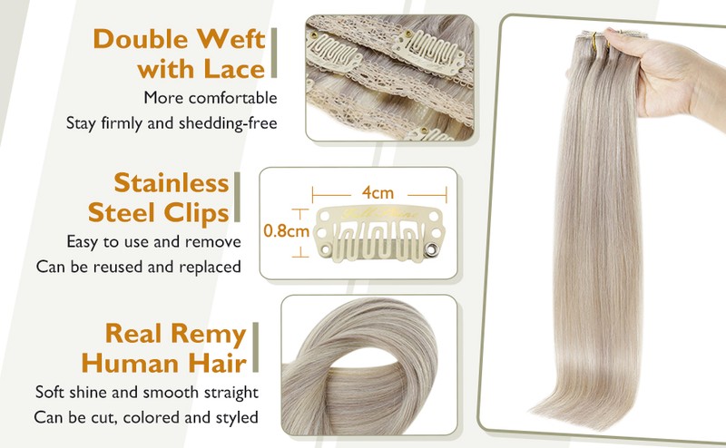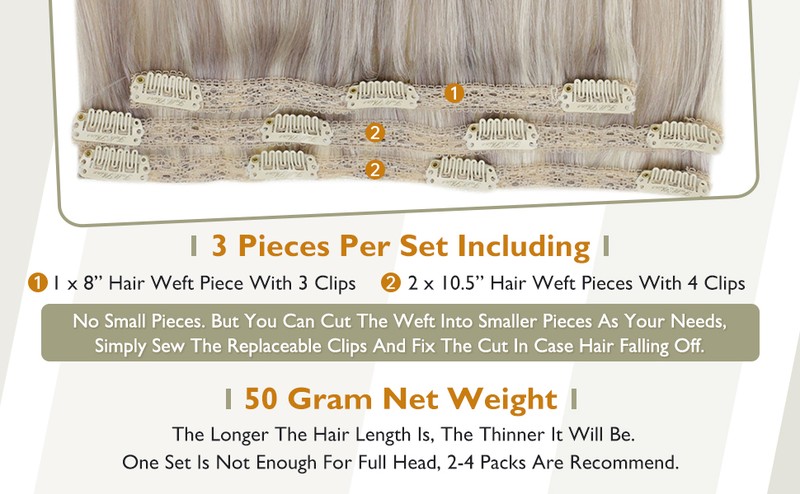 8. designnovo conjunto design】equipe de brilho completo só fez 3 peças para 50 gramas clipe de renda em extensões de cabelo. Sabemos que você não gosta de pequenos pedaços. Então 1x8 Polegada peças de trama de cabelo com 3 clipes; 2x10.5 Polegada peça de trama de cabelo com 4 clipes totalmente! Embora você queira 150 gramas, há apenas 9 peças totalmente! Não precisa se preocupar com onde devo aplicar as peças, nunca!