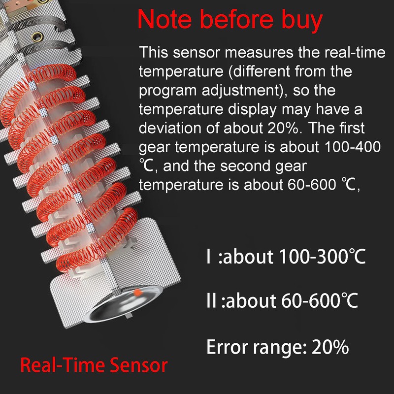 Nota: este sensor mede a temperatura em tempo real (diferente do ajuste do programa), de modo que a exibição de temperatura pode ter um desvio de cerca de 20%. A primeira temperatura da engrenagem é de cerca de 100-400 ℃, e a segunda temperatura da engrenagem é de cerca de 60-600 ℃,