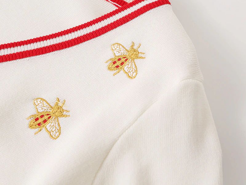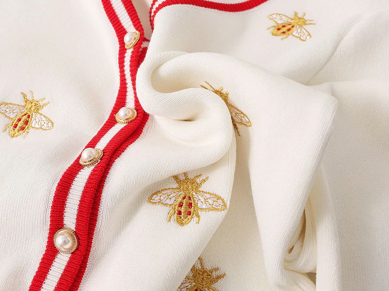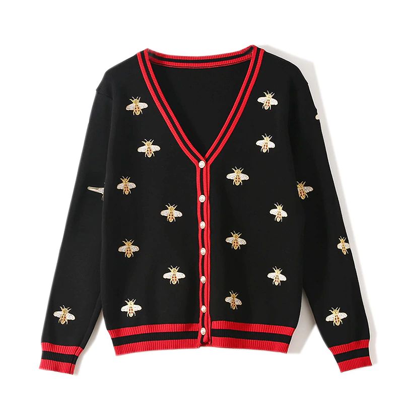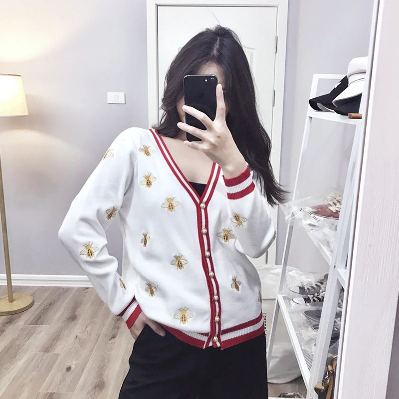 Alta Qualidade Designer De Moda Abelha Bordado Cardigan Manga Longa Único Breasted contraste Cor Botão Malha Blusas C-196