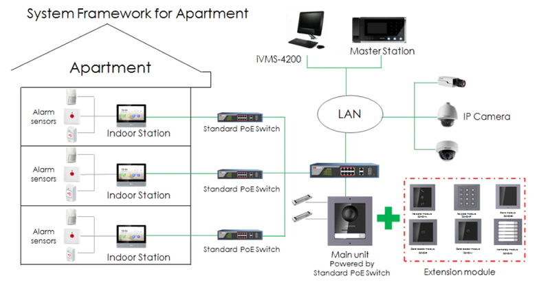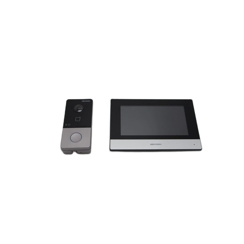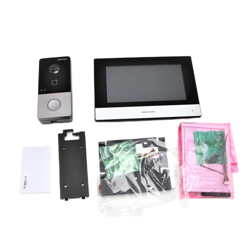 Este“Cor: DS-KIS603-P(B) ”Kit inclui uma unidade interna DS-KH6320-WTE1, e um telefone da porta DS-KV6113-WPE1, que suporta fonte de alimentação poe e inclui dois adaptador de energia.