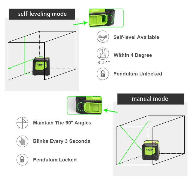 Bloquear o pêndulo, você pode (use o tripé ou o outro suporte) colocar a ferramenta do laser em vários ângulos para projetar linhas retas não niveladas do laser. O raio laser piscará a cada 3-5 segundos para lembrá-lo que não está se nivelando agora.