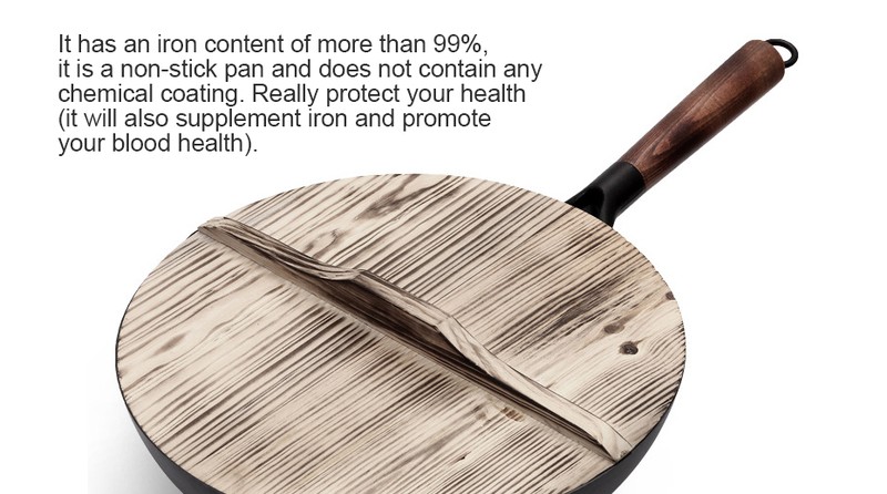 Porque tem um teor de ferro de mais de 99%, é uma panela antiaderente e não contém nenhum revestimento químico. Realmente proteja sua saúde (também complementará o ferro e promoverá sua saúde sanguínea).