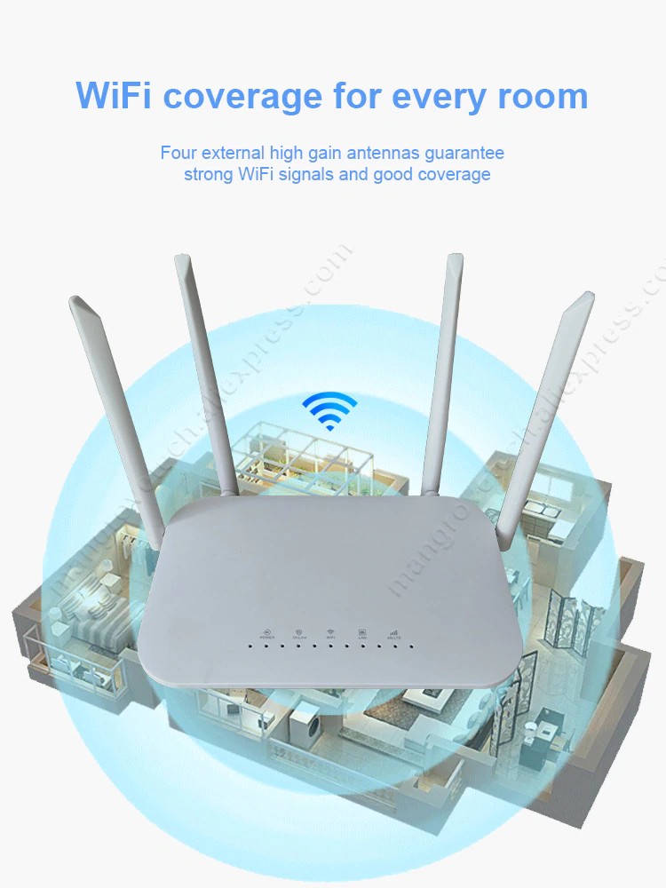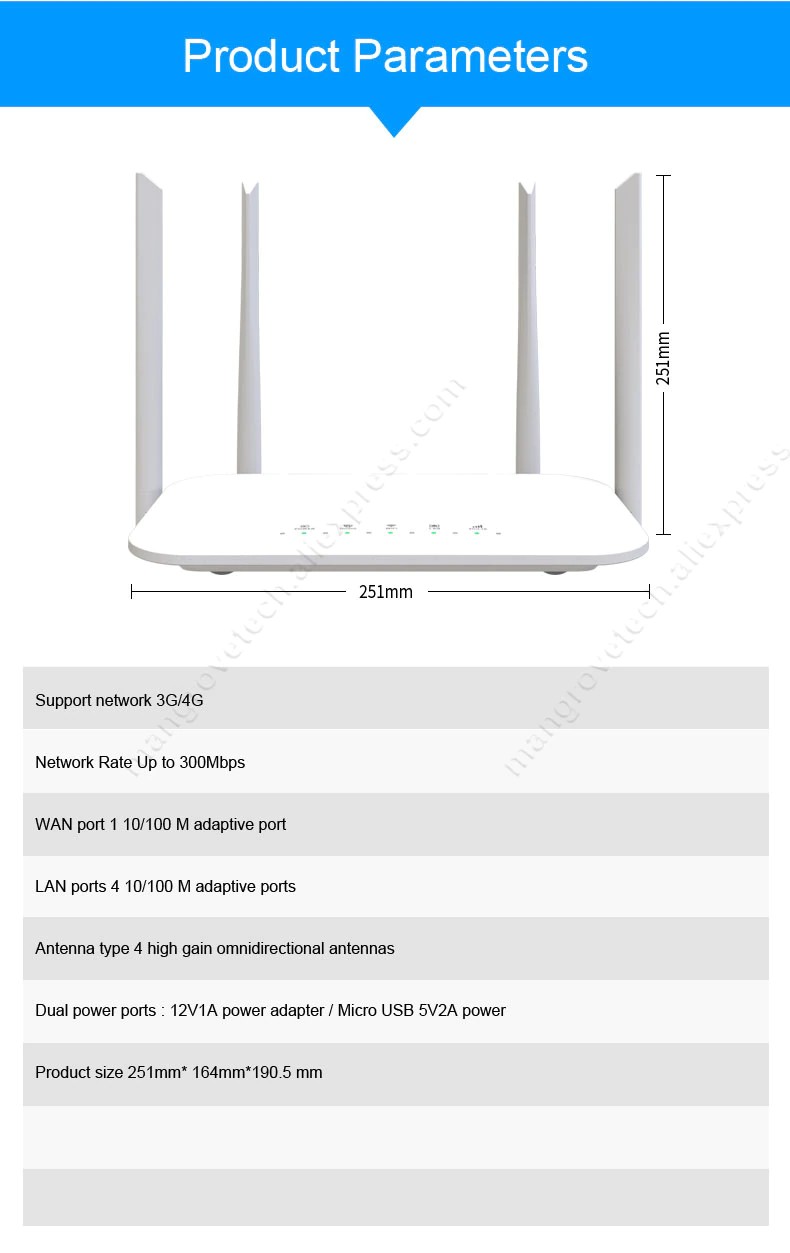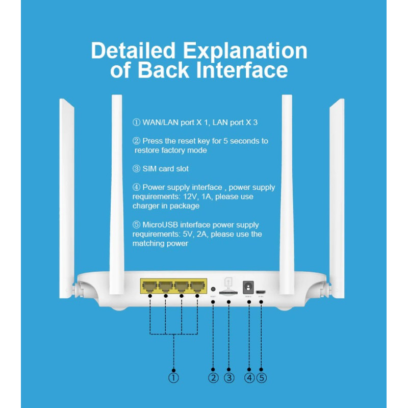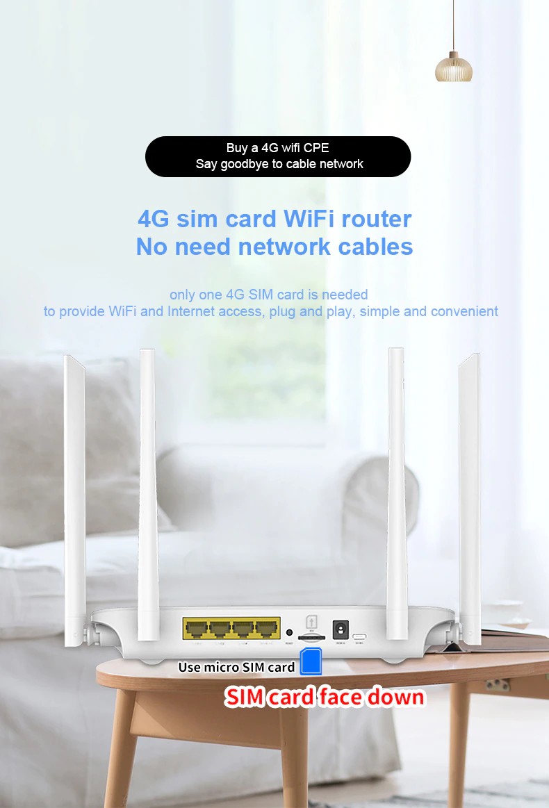 Lc117 4g cpe é um desktop 4g lte roteador wi-fi, ele tem 2 portas de entrada de energia (12v e 5v), quatro antenas externas, 4 portas rj45, suporte 32 usuários wi-fi, use micro cartão sim.