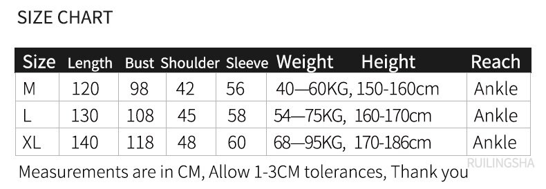 Busto 108cm, largura do ombro 45cm, manga 58cm, comprimento da veste 130cm.
