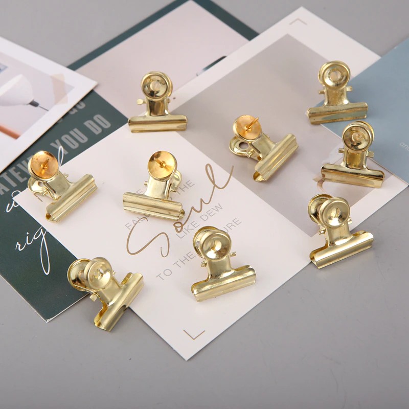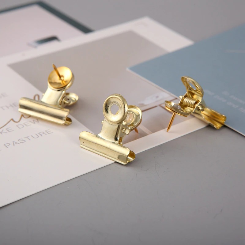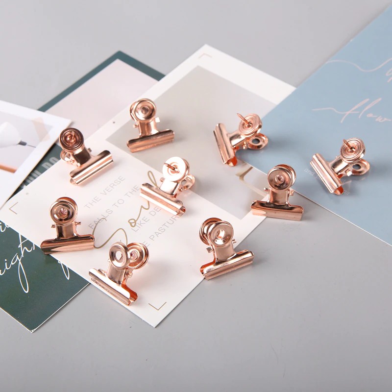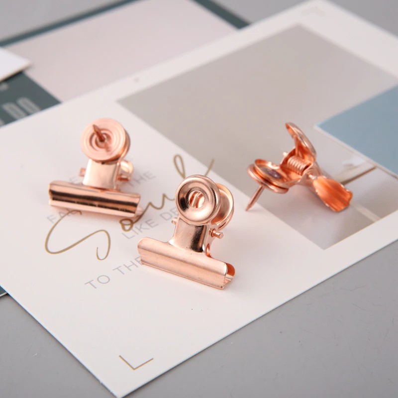 Mogii 9 Pçs/Caixa Acessórios Da Escola De Escritório Ouro Rosa Metal Bulldog Clipe Multifunções Empurrar Pinos À Moda Tachas Polegar Para Placa Cortiça