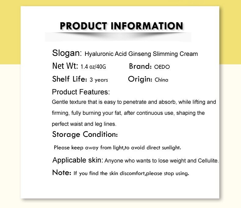 Características do produto:O extrato de ginseng é perfeitamente combinado com o ácido hialurônico, contém uma variedade de emolientes do corpo, uma textura suave que é fácil de penetrar e absorver, ao levantar e firmar, queimando totalmente sua gordura, após o uso contínuo, moldar as linhas perfeitas da cintura e das pernas.