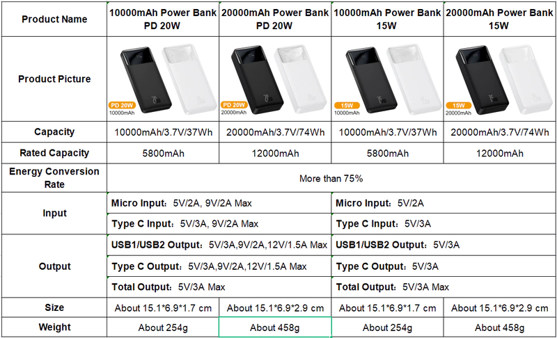 Capacidade classificada: 30000mAh = 18000mAh, 20000mAh = 12000mAh, 10000mAh = 5800mAh