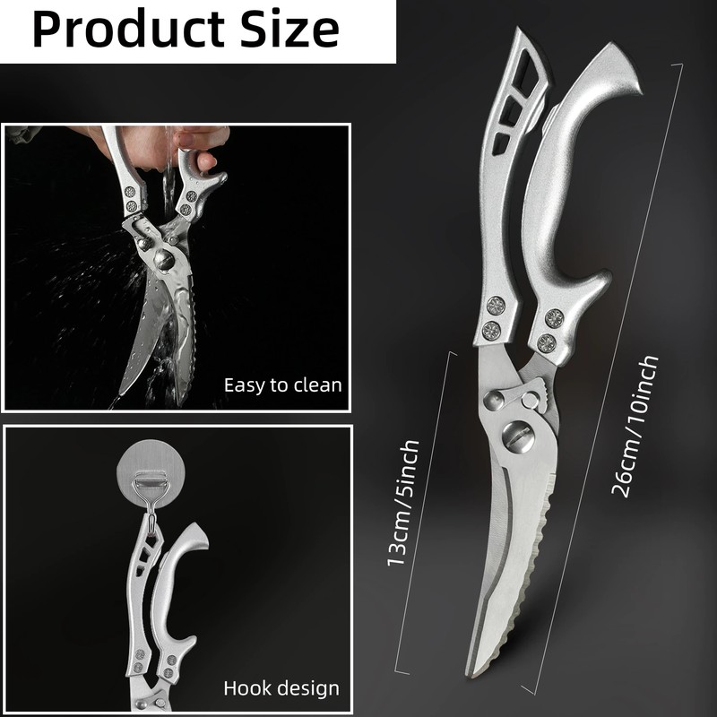 As lâminas são feitas de aço inoxidável 4cr13, que é amplamente utilizado na fabricação de facas de chef de alta qualidade. A lâmina torna-se mais nítida, o que pode evitar ferrugem e corrosão. Esta tesoura de cozinha pode ser usada para cortar a turquia, cortar carne crua, legumes, churrasco, peixe, etc.