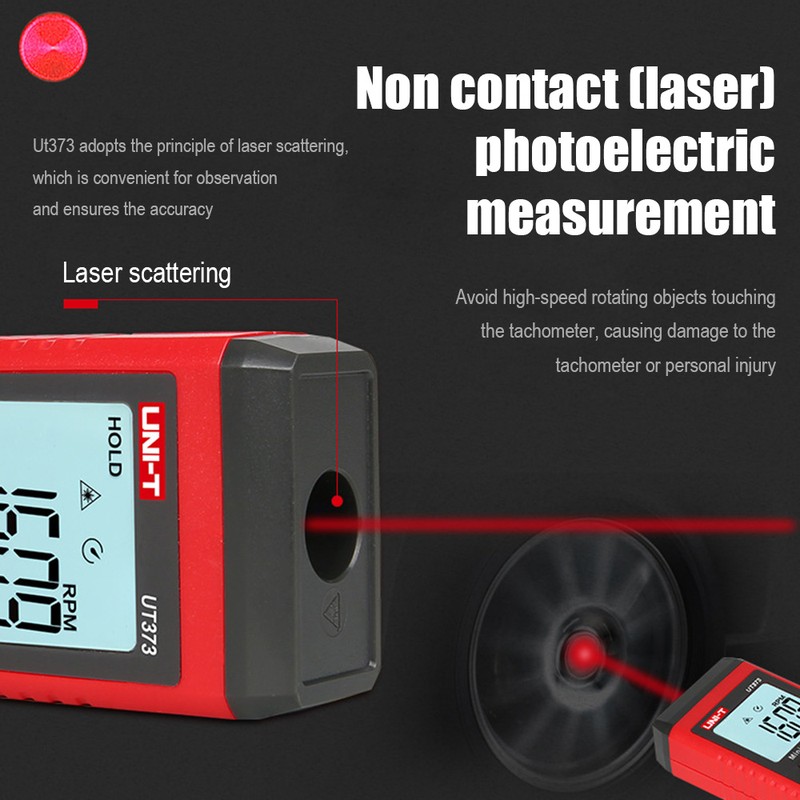 Ut373 é um tacômetro digital confiável do não-contato usado para medir a velocidade de rotação dos motores e de outras máquinas. Ut373 é capaz de medir com segurança objetos rotatórios através de um método não-intrusivo.
