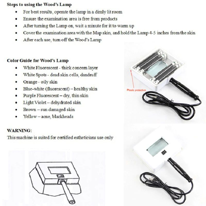 A lâmpada de madeira ajuda a identificar claramente as qualidades, problemas e as condições incomuns da pele, a fim de fornecer tratamentos adequados, examinar diferentes peles, tipos ou partículas e condições da pele, detecta imperfeições na pele normalmente invisíveis aos olhos. Permite que o esteticista conduza plano de tratamento para o rosto adequado.