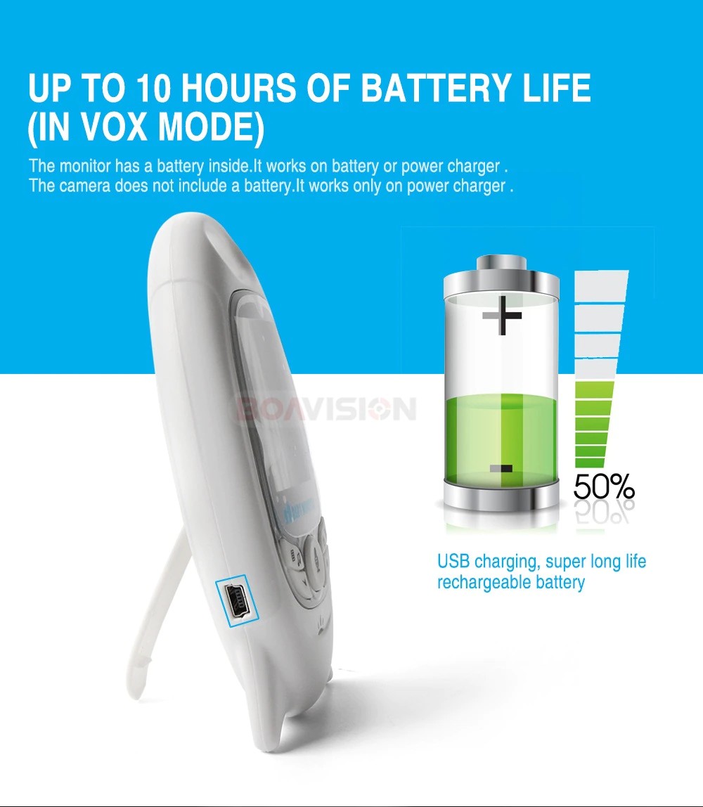 5. até 8 horas de vida útil da bateria (no modo vox). Não há necessidade de carregar a bateria para o monitor durante toda a noite no modo vox.
