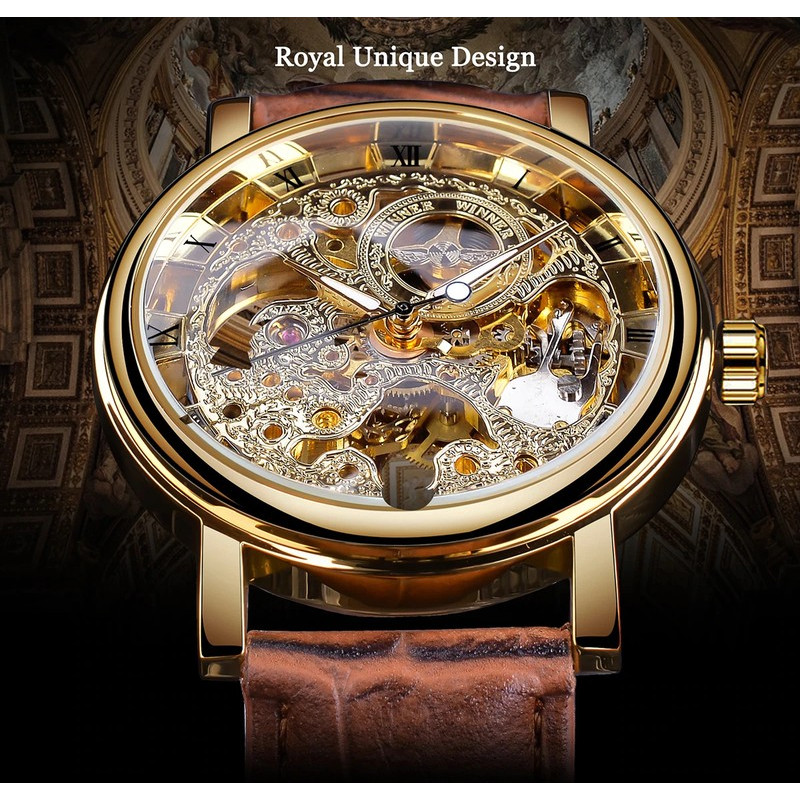 Vencedor Caso De Ouro Transparente Luxo Design Casual Pulseira De Couro Marrom Relógios Masculinos Marca Superior Luxo Relógio Esqueleto Mecânico