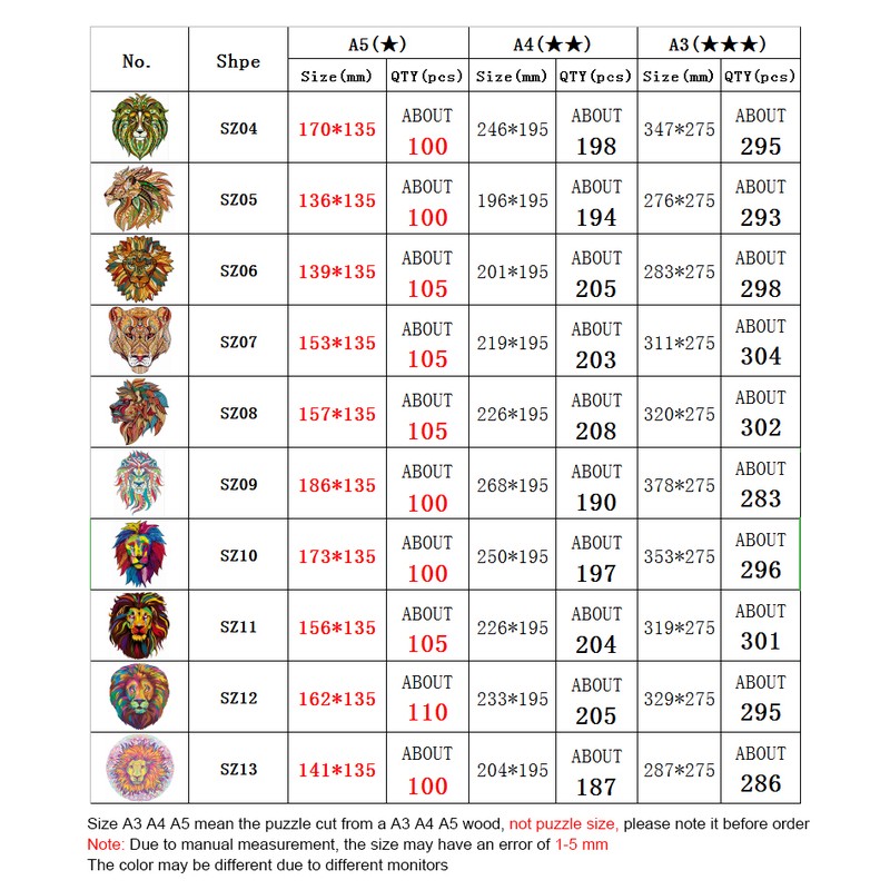 Tamanho a3 a4 a5 significa o corte do quebra-cabeça de uma madeira a3 a4 a5, não o tamanho do quebra-cabeça, observe antes de fazer o pedido