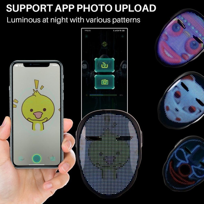 3. led bluetooth face cover: app controle de bluetooth, você pode digitalizar o código qr de acordo com o manual, se conectar ao produto e personalizar a capa de rosto para fazer a festa brilhar.