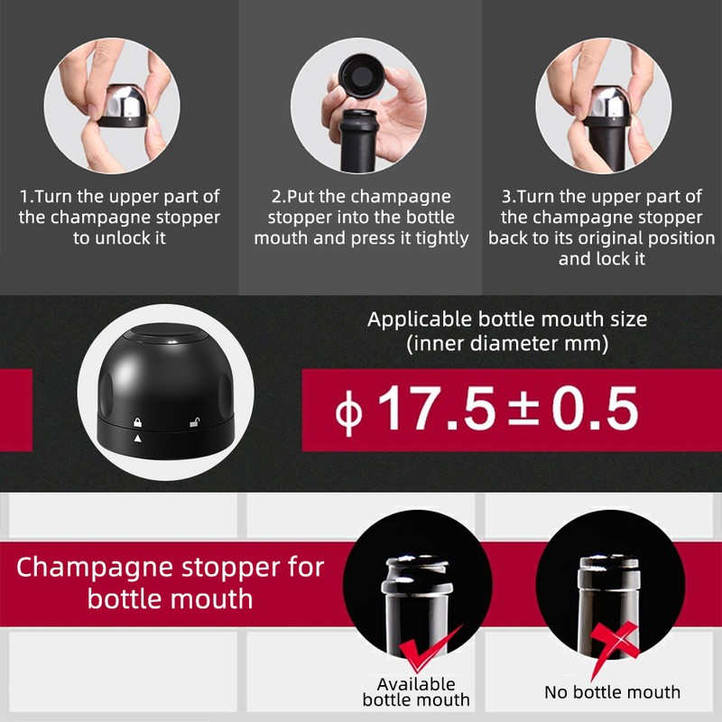 [Высокое качество]Внутренние уплотнительные части винной пробки выбраны для пищевых контактных силиконовых материалов и безопасны. Круглые цвета шампанского пробкового корпуса изготовлены из прочного материала ABS, который не легко носить и легко чистить.