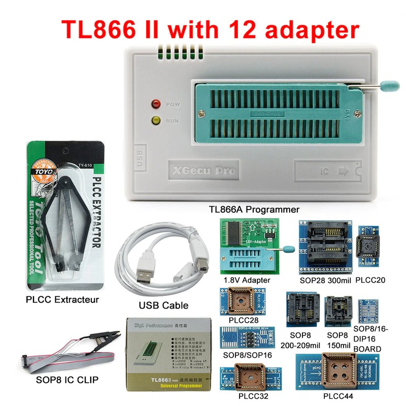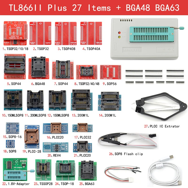 Товар включает в себя следующее(Только для TL866II PLUS с 28 адаптерами)