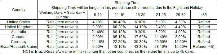 Примечание: авиа-отправление Почты Китая/посылка просто относится к мировой почтовой системе, которая намного медленнее, чем специальная доставка. Обычно товары прибывают в течение 7-25 рабочих дней по всему миру. И время доставки также зависит от некоторых факторов включая различные регионы доставки. Таблица времени прибытия товара приведена ниже для вашего вывода: