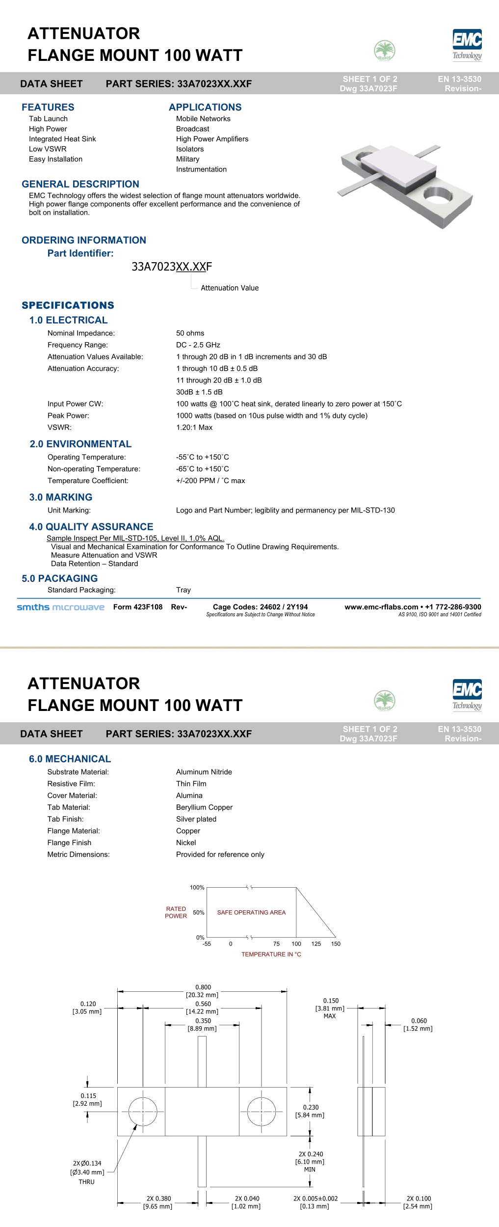 30dB 100 Вт аттенюатор с фланцевым креплением 33A7023 100 Вт 30.00dB 50 Ом DC-2.5GHz 33A702330.00F